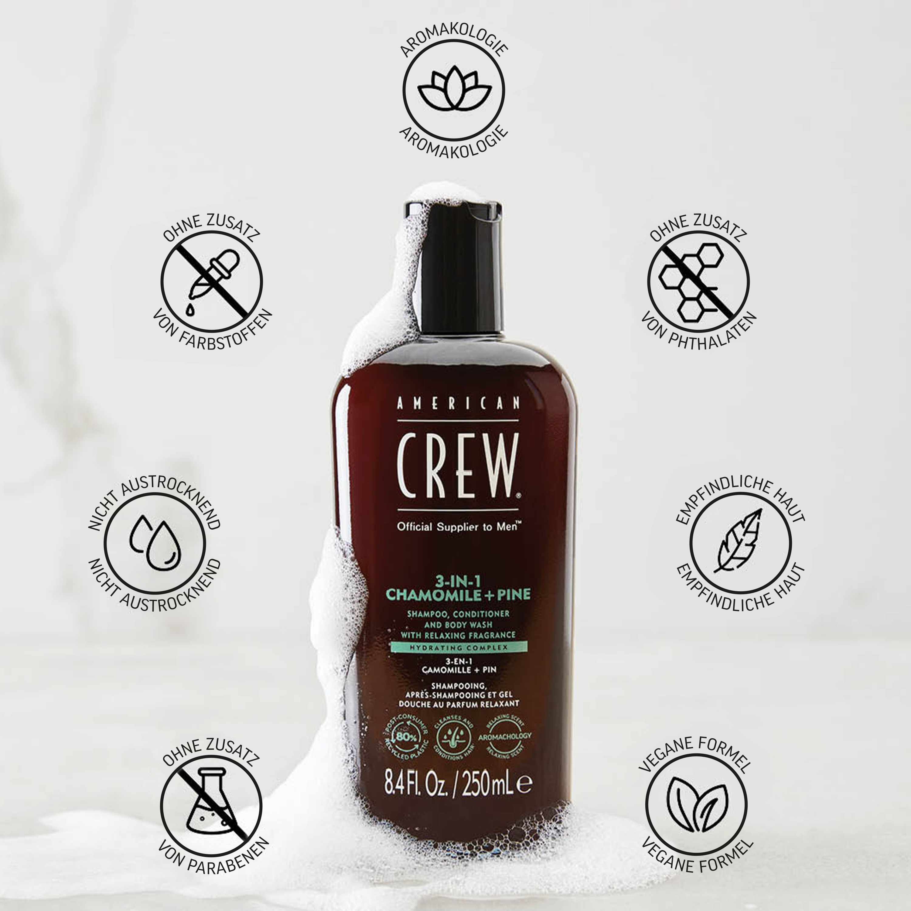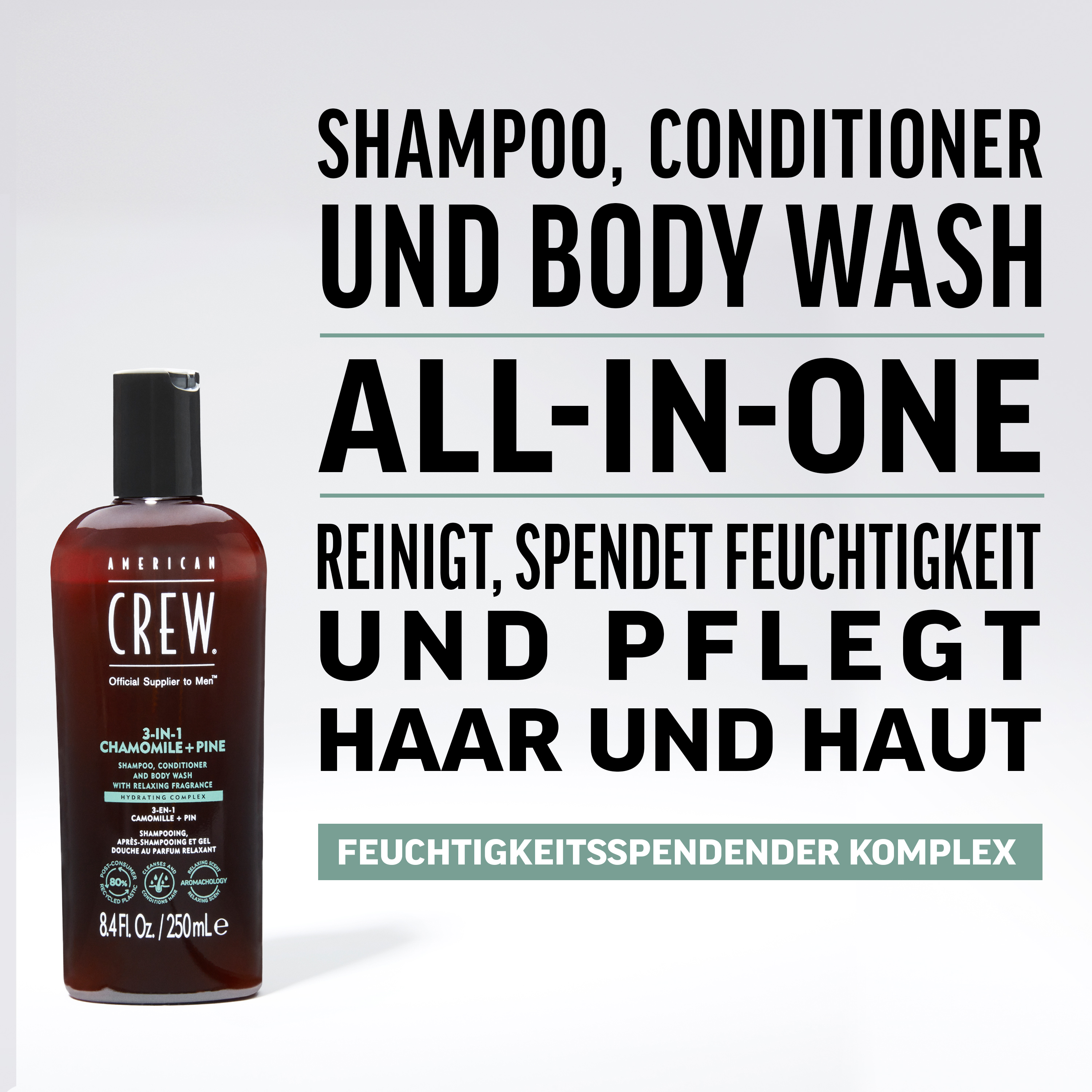 Das praktische American Crew Chamomile + Pine Relaxing 3-in-1 Shampoo mit entspannendem Duft von Kamille + Kiefer vereint drei Pflegeprodukte in einem und schenkt Deiner Männlichkeit die optimale Rundum-Pflege. Die leichte Formel des Pflegeshampoos verleiht dem Haar nicht nur ein angenehmes Tragegefühl, sondern reinigt sowohl den Körper, als auch die Haare und Kopfhaut sanft und effektiv. Das American Crew Chamomile + Pine Relaxing 3-in-1 Shampoo ist für jeden Haartyp geeignet und ideal für alle Männer, die Wert auf ein stilvolles Äußeres legen. Es pflegt Haar und Kopfhaut ohne zu beschweren und entfernt überschüssiges Fett sowie Unreinheiten, während es die Körperhaut remineralisiert und ihr Geschmeidigkeit verleiht. Zudem entwirrt es und sorgt für einen natürlichen Glanz gepflegter Männerhaare. Dank der 3 in 1 Eigenschaften ist das Produkt zudem der ideale Begleiter für unterwegs.