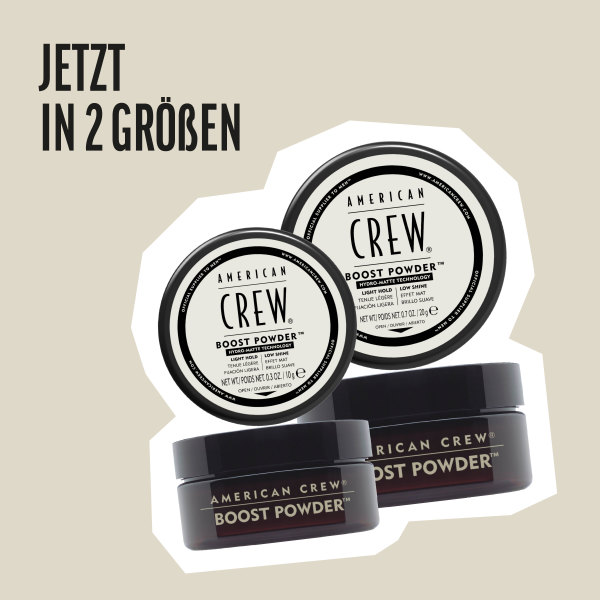 American Crew® Boost Powder™ verleiht Ihrem Haar Volumen, Dichte und ein mattes Finish. Im praktischen Tiegel haben Sie das perfekte Styling immer griffbereit. Das leichte Volumenpuder schenkt Ihrem Haar viel Ansatzvolumen und Griffigkeit bei mittlerem Halt und gibt ihm zudem eine dramatische Textur, die der Schwerkraft trotzt. Die Formel enthält Propylenglykol, das die natürliche Feuchtigkeit erhält und das Haar geschmeidig macht, Kieselsäure-Silylat, das für flexiblen Halt sorgt und und Volumen verleiht, sowie Zitronensäure, die das Haar revitalisiert und und adstringierend wirkt. American Crew® Boost Powder™ kann mit jedem anderen Stylingprodukt von American Crew kombiniert werden.
