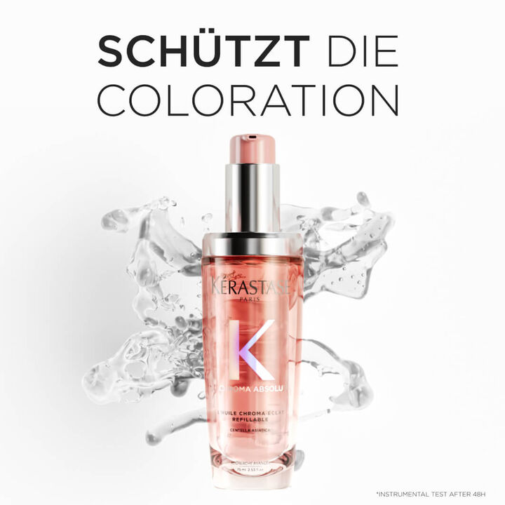 Das nachfüllbare Haaröl L‘Huile Chroma Éclat verleiht coloriertem Haar lang anhaltenden Glanz. Das mit der tropischen Wildpflanze Centella Asiatica angereicherte Haaröl schützt die Coloration und verleiht dem Haar eine verführerisch duftende Aura.