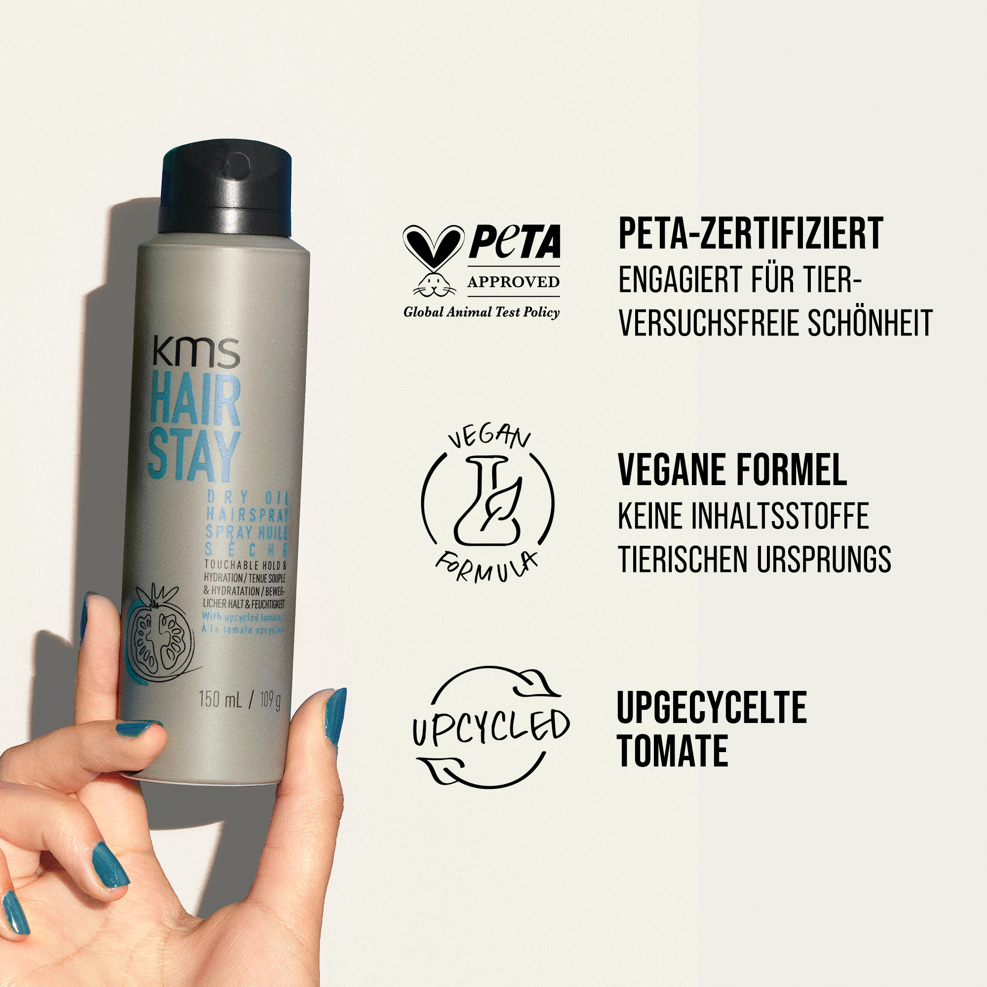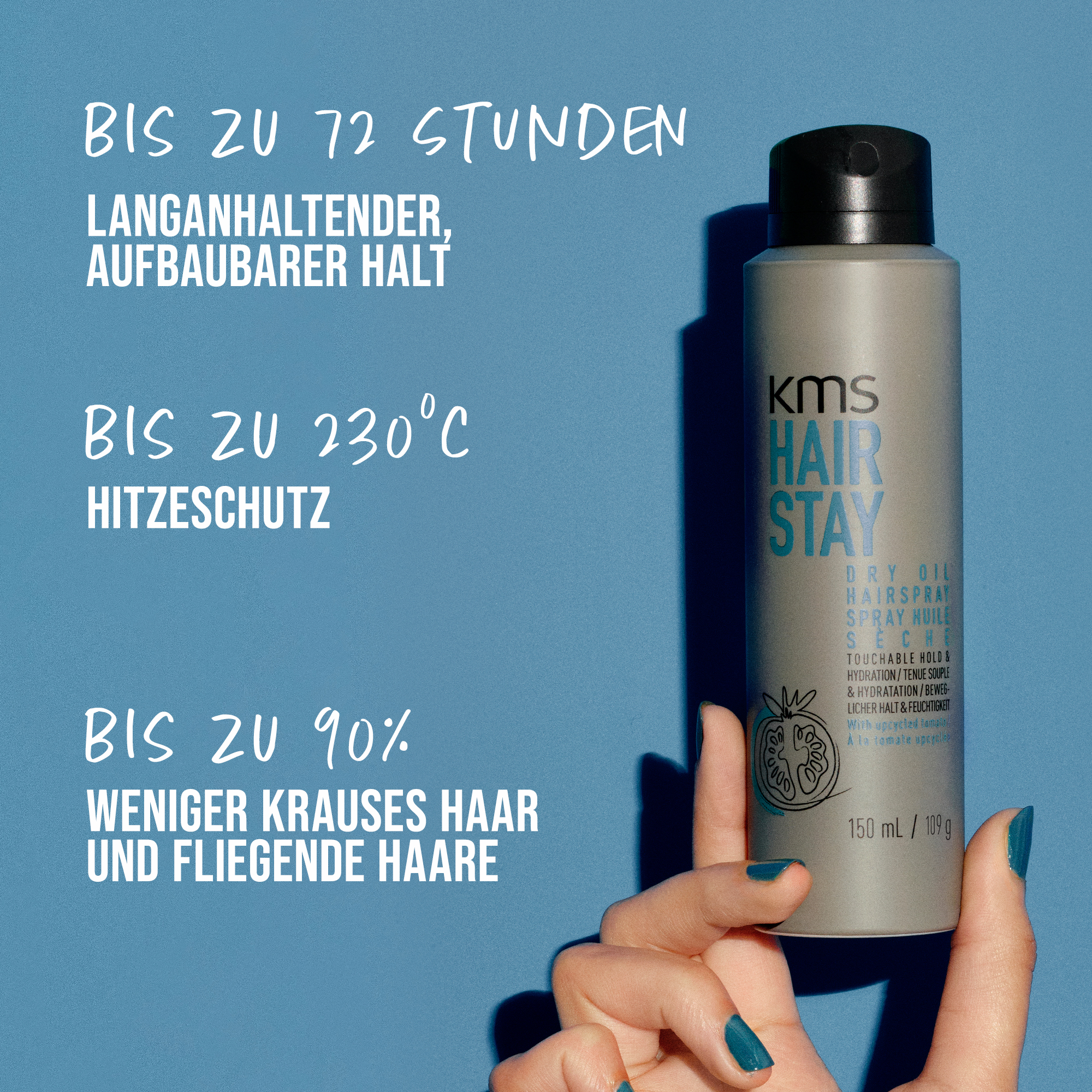 Das KMS HairStay Dry Oil Hairspray bietet flexiblen, leichten Halt für bis zu 72 Stunden. Die schnell trocknende Formel sorgt für ein weiches, glänzendes Finish ohne zu kleben und bündelt und definiert Locken und Wellen. Es beseitigt Frizz und fliegende Haare um bis zu 90 %, bietet lang anhaltenden Feuchtigkeitsschutz für bis zu 72 Stunden und verstärkt den Glanz bis zu 2 Mal. Die Formel mit upgecycelter Tomate, die als starkes Antioxidans bekannt ist, hilft, vor UV- und Umwelteinflüssen zu schützen.
