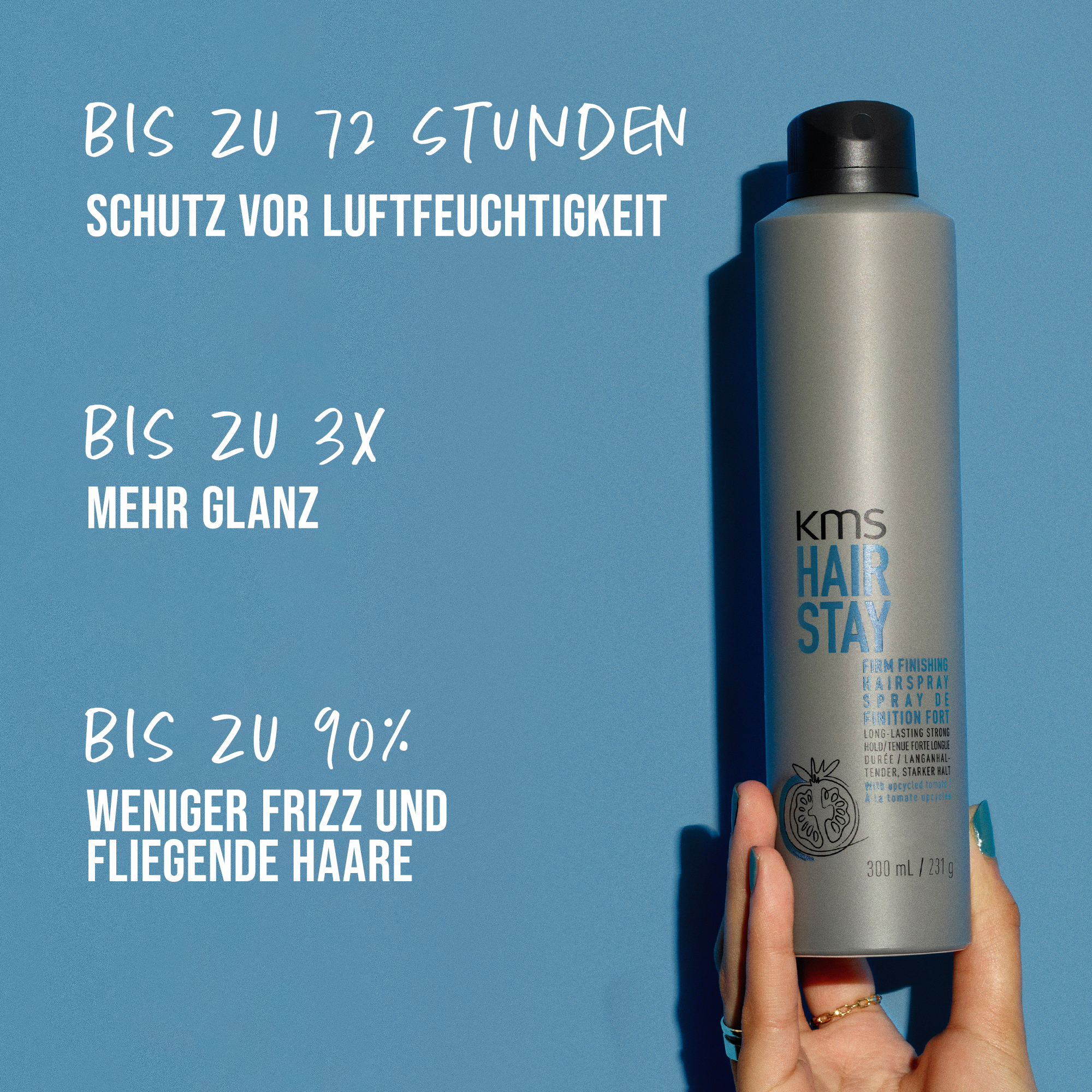 Mittelstarkes Haarspray Das KMS HairStay Firm Finishing Haarspray bietet starken, lang anhaltenden Halt für bis zu 72 Stunden. Die schnell trocknende Formel sorgt für ein natürliches Finish, ohne zu kleben oder zu schuppen, bietet lang anhaltenden Schutz vor Frizz und Feuchtigkeit für bis zu 72 Stunden und eliminiert Frizz und fliegende Haare um bis zu 92 %. Die Formel mit upgecycelter Tomate, die als starkes Antioxidans bekannt ist, hilft, vor UV- und Umwelteinflüssen zu schützen.