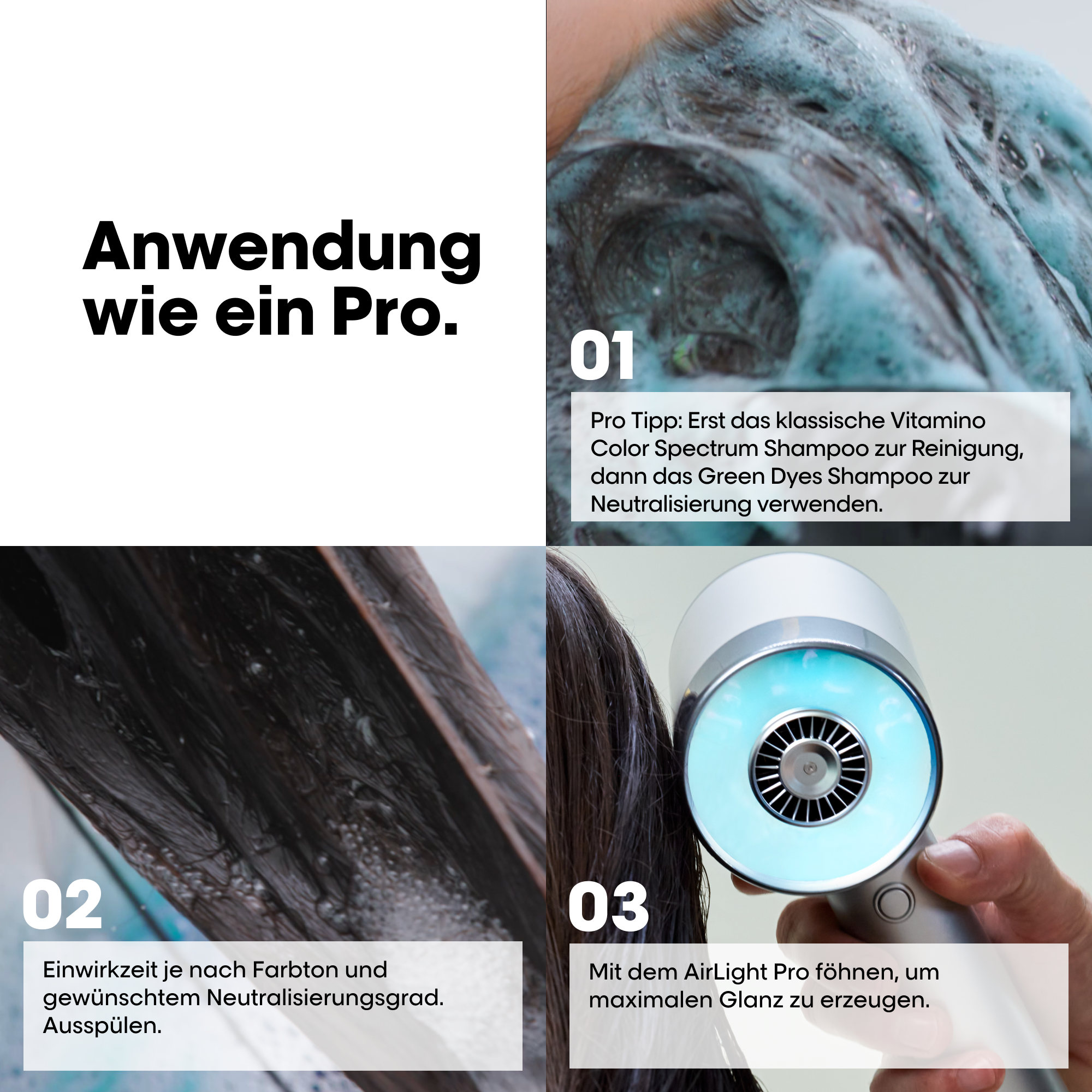 - Neutralisiert unerwünschte Rottöne bei dunkelbraunem und schwarzem Haar.