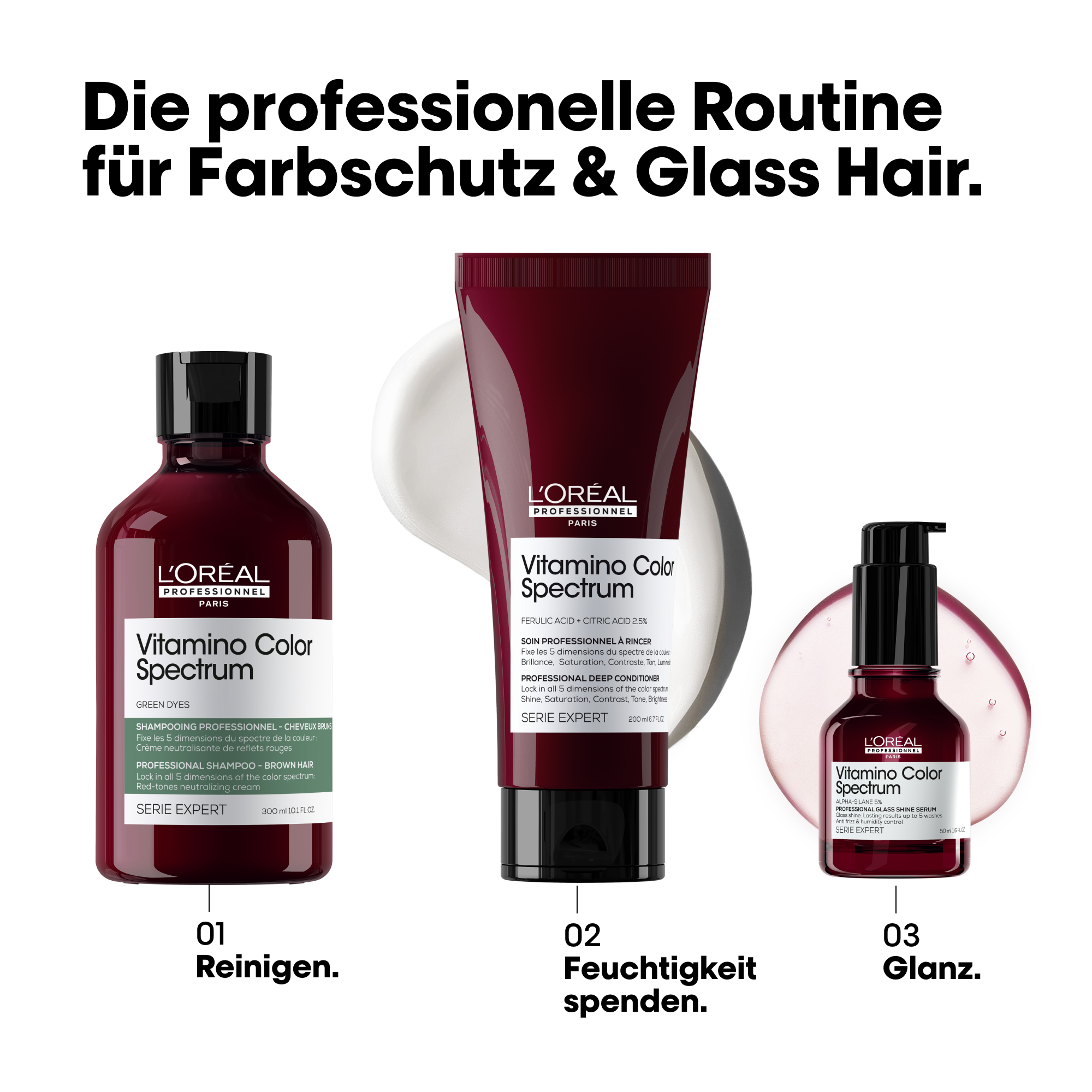 Als Teil der vollständigen Vitamino Color Spectrum Routine hilft das Produkt, die Farbbrillanz von coloriertem Haar in allen 5 Farbdimensionen zu erhalten:*