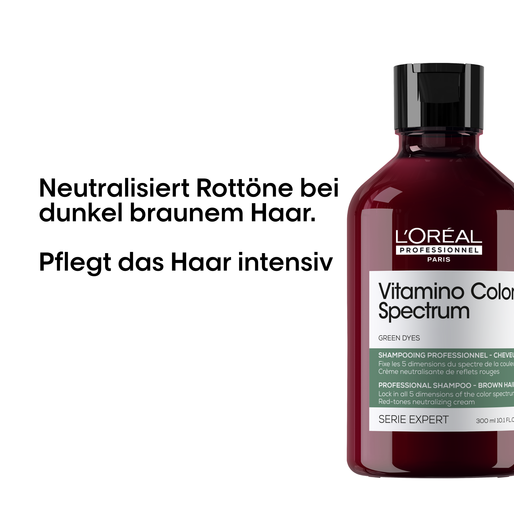 Das Vitamino Color Spectrum Green Dyes Neutralizing Shampoo von L'Oréal Professionnel wurde speziell für dunkelbraunes und schwarzes Haar entwickelt. Angereichert mit grünen Farbpigmenten und pflegenden Inhaltsstoffen, neutralisiert die cremige Formel sofort unerwünschten Rotstich bei dunklem Haar. Das Haar wird gereinigt und gepflegt.