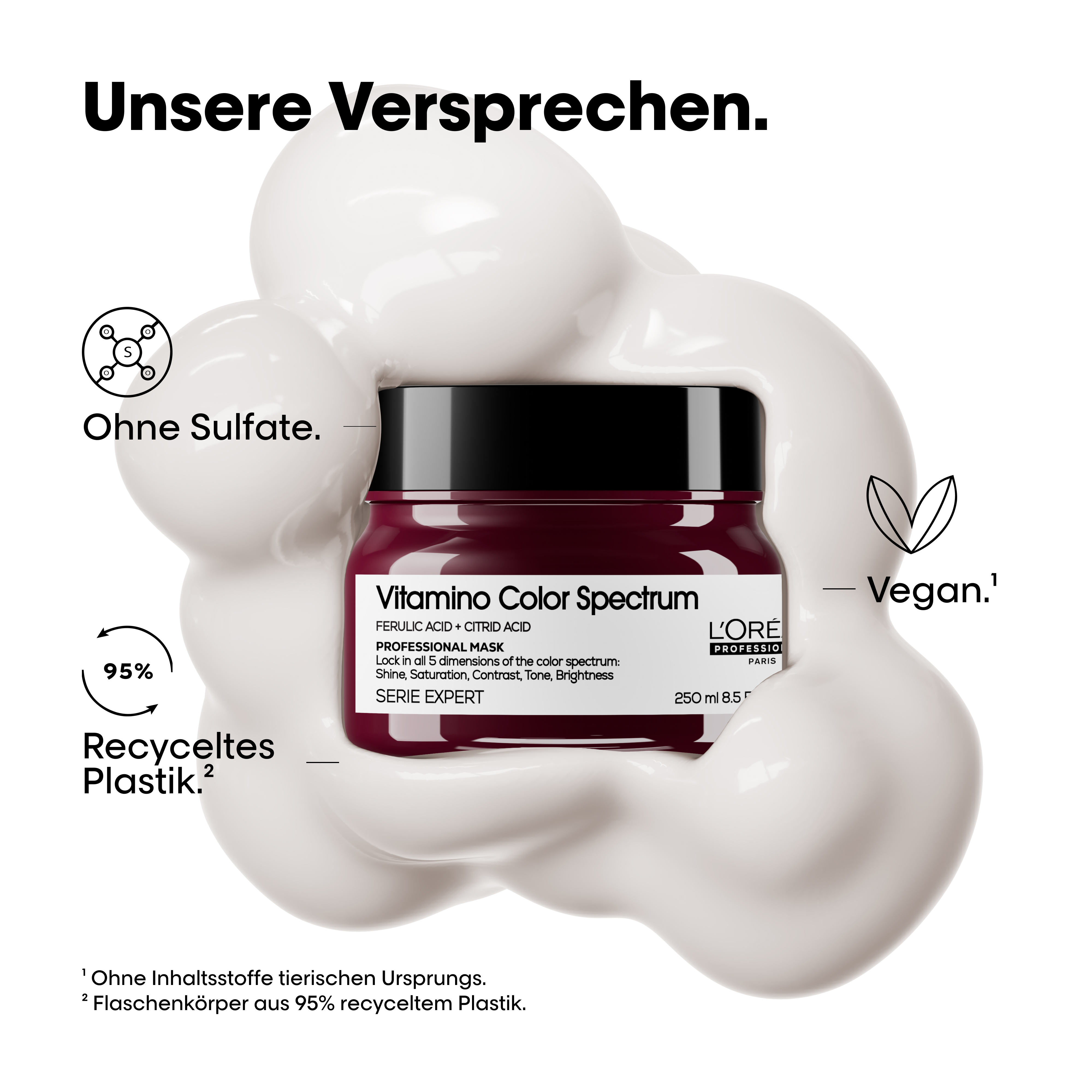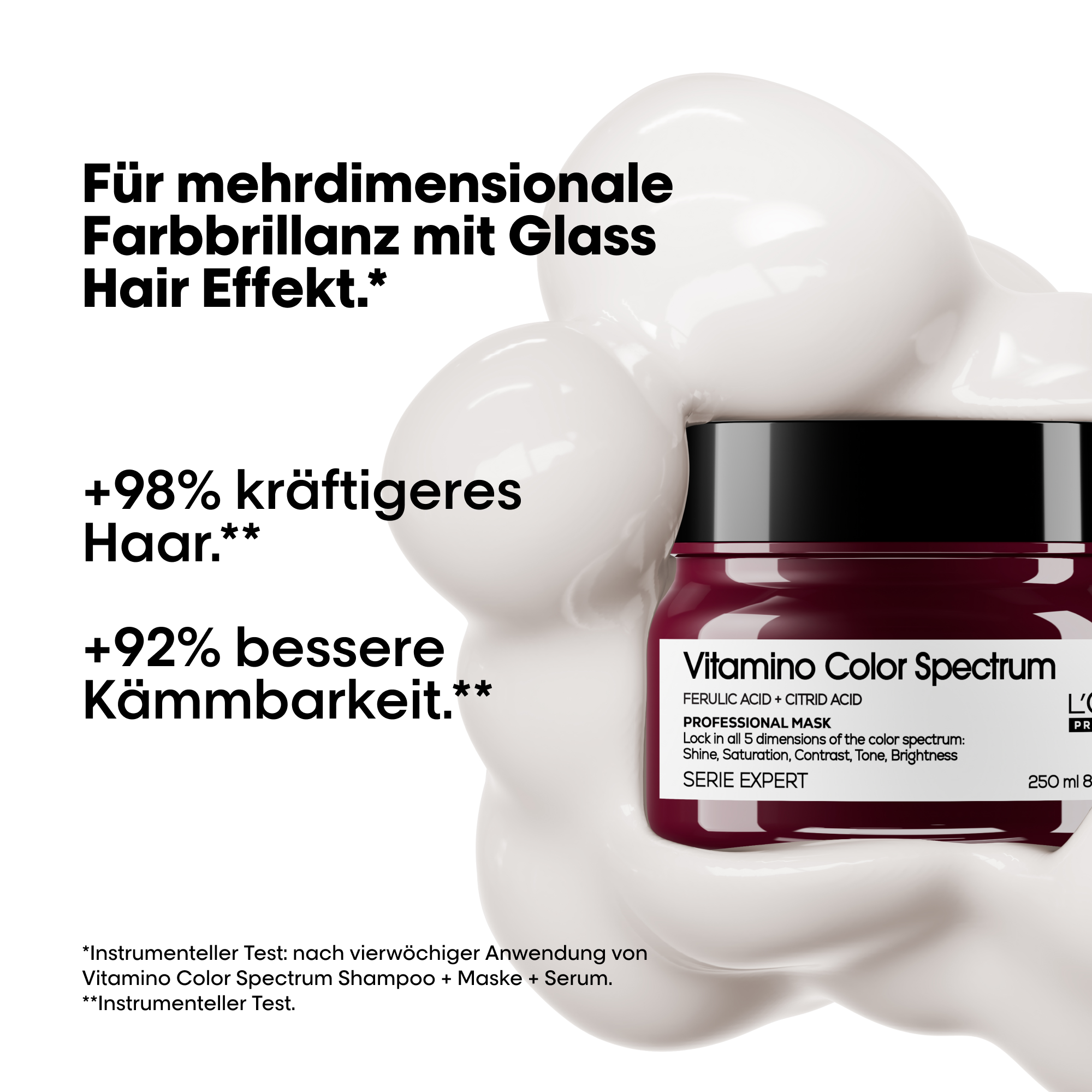 Die Vitamino Color Spectrum Maske von L'Oréal Professionnel wurde speziell für coloriertes Haar entwickelt. Angereichert mit Ferulasäure und Zitronensäure hilft sie, die Farbpigmente im Haar einzuschließen und so die Brillanz in allen 5 Farbdimensionen zu erhalten.*