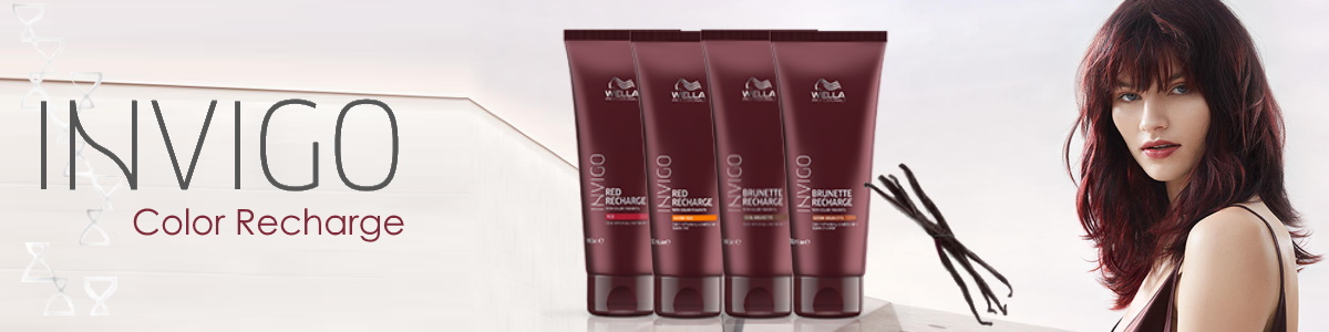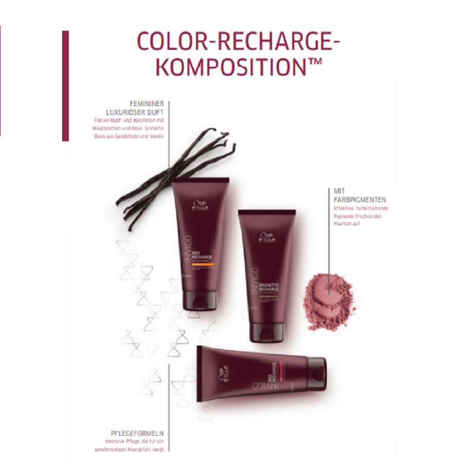 Eine Serie mit Farbpigmenten Angereichert und für sofortige Pflege. INVIGO Color Recharge mit Color Recharge-Komposition™, frischt die Leuchtkraft und Brillanz von Brünett- und Rottönen auf und trägt zum längeren Farberhalt bei. Mit Farbpigmenten. Florale, sanfte, pudrige Duftnote.