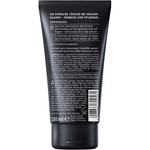 Die Plantur 39 Anti-Grau-Effekt Färbende Spülung färbt graues Haar dunkler. In Kombination mit dem Anti-Grau Effekt Shampoo wird ein noch gleichmäßigeres und intensiveres Farbergebnis erzielt. Sichtbar werdende graue Ansätze und erste graue Strähnen werden so noch effektiver kaschiert. Aufgrund der starken Farbleistung kann die Plantur 39 Anti-Grau Effekt Färbende Spülung auch mit jedem anderen Plantur 39 Shampoo verwendet werden.