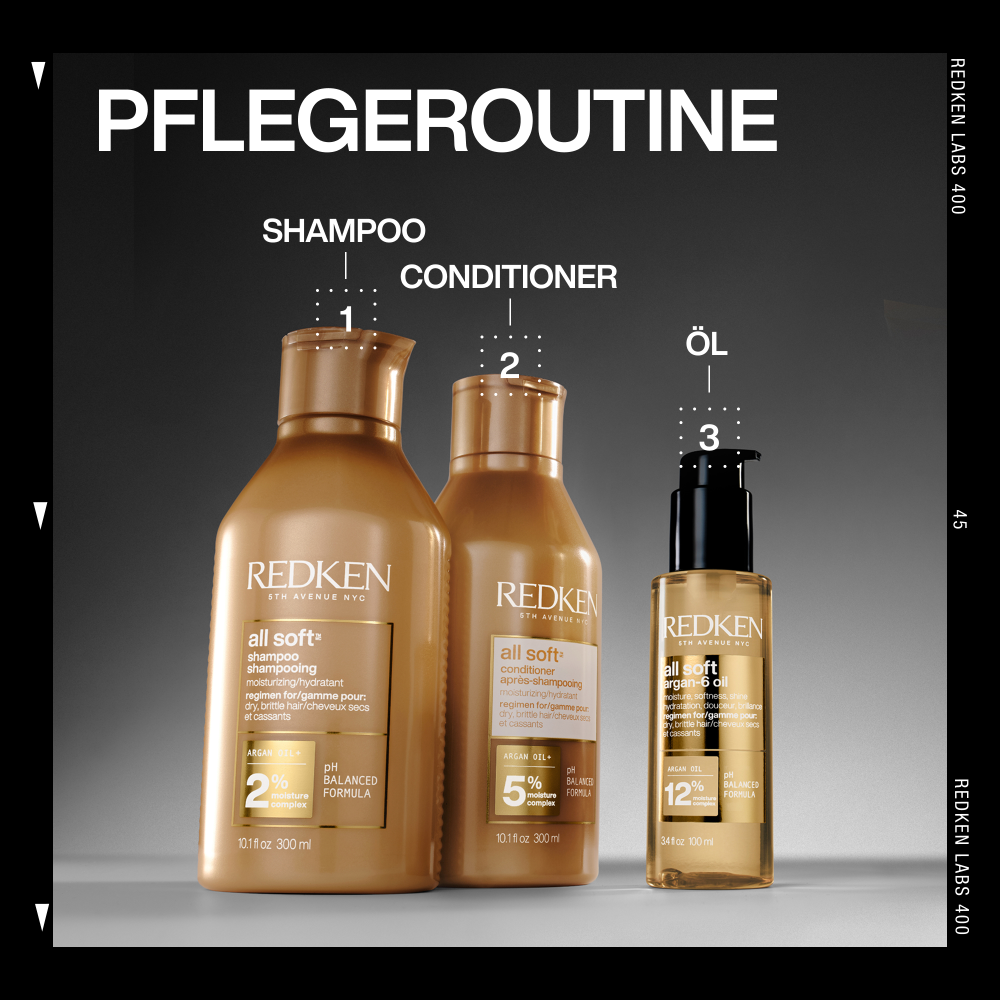 Das Argan-6 Oil ist Redken's Lösung, um trockenes, sprödes Haar langanhaltend mit Feuchtigkeit zu versorgen. Die leichte, nicht beschwerende Formel ist mit dem bekannten Inhaltsstoff Argan-Öl sowie einem Feuchtigkeitskomplex angereichert. Diese Kombination erhöht die Elastizität der Haare, spendet intensive Feuchtigkeit und glättet die Haarfaser. Zudem schützt dieses Multi-Benefit Haaröl vor Hitze bis zu 230°C und vor Luftfeuchtigkeit, sodass Hitzestyling-Schäden sowie Frizz vorgebeugt wird. Für gesund aussehendes, glänzendes und geschmeidiges Haar. Who says you can't have it all?