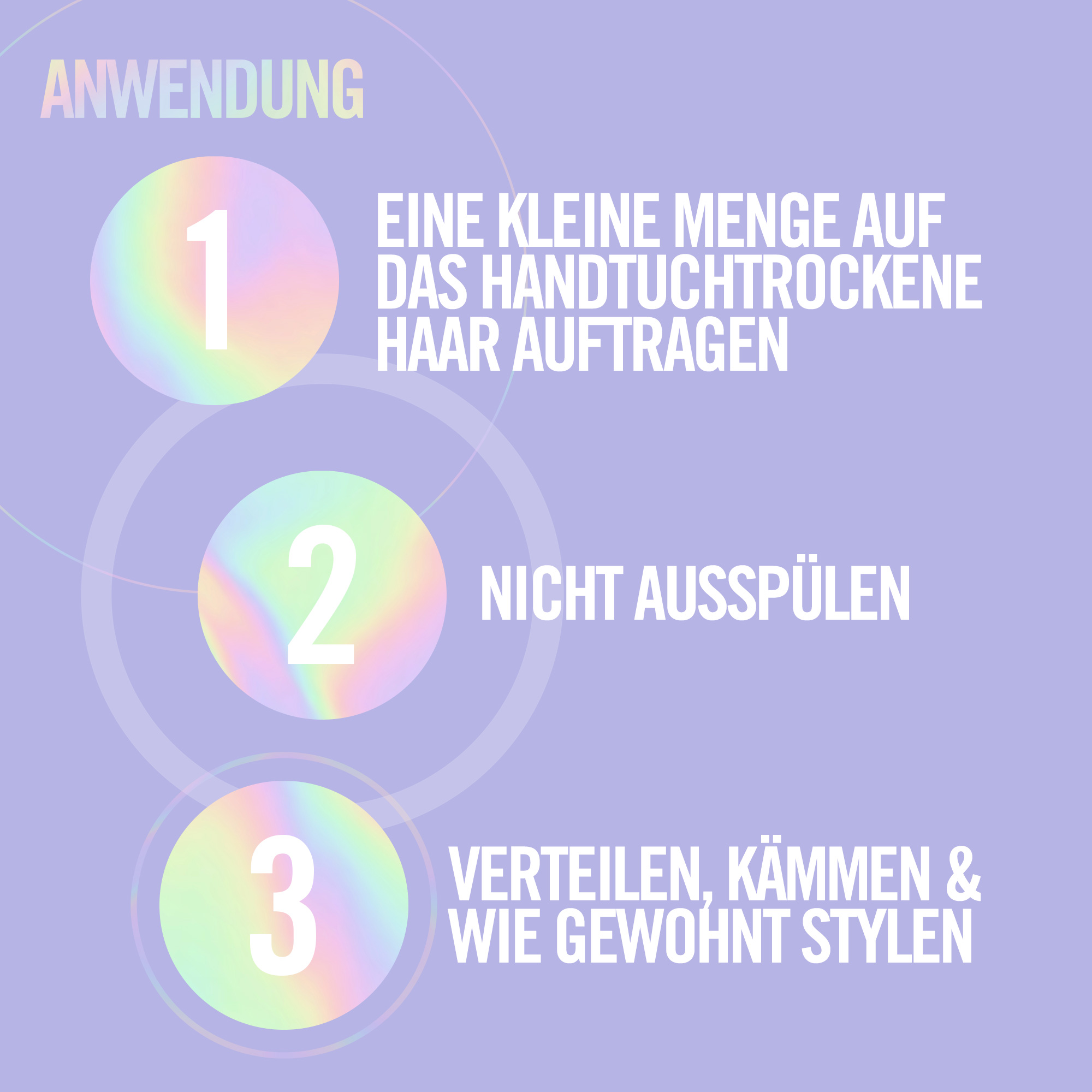 Eine kleine Menge auf das handtuchtrockene Haar auftragen. Nicht ausspülen. Verteilen, kämmen und wie gewohnt stylen.