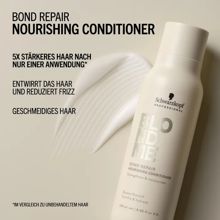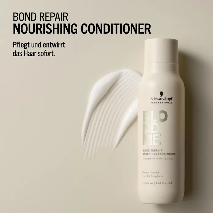 Der BLONDME Bond Repair Nourishing Conditioner mit der BOND REPAIR TECHNOLOGIE entwirrt und pflegt blondes Haar sofort, ohne es zu beschweren, und hinterlässt ein mit Feuchtigkeit versorgtes Haargefühl. Es stärkt das Haar durch den Aufbau innerer Haarverbindungen und repariert Haarschäden, die zwei Aufhellungsservices entsprechen - bereits nach nur einer Anwendung. Die pflegende Formel angereichert mit Mandelöl und weißem Tee glättet das Haar und verleiht ihm Geschmeidigkeit und einen gesund aussehenden Glanz.