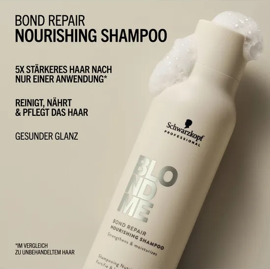 Das BLONDME Bond Repair Nourishing Shampoo mit der BOND REPAIR TECHNOLOGIE reinigt blondes Haar sanft und versorgt es mit Feuchtigkeit. Es stärkt das Haar durch den Aufbau innerer Haarverbindungen und repariert Haarschäden, die zwei Aufhellungsservices entsprechen - bereits nach nur einer Anwendung. Die pflegende Formel angereichert mit Mandelöl und weißem Tee glättet das Haar und verleiht ihm Geschmeidigkeit und einen gesund aussehenden Glanz.