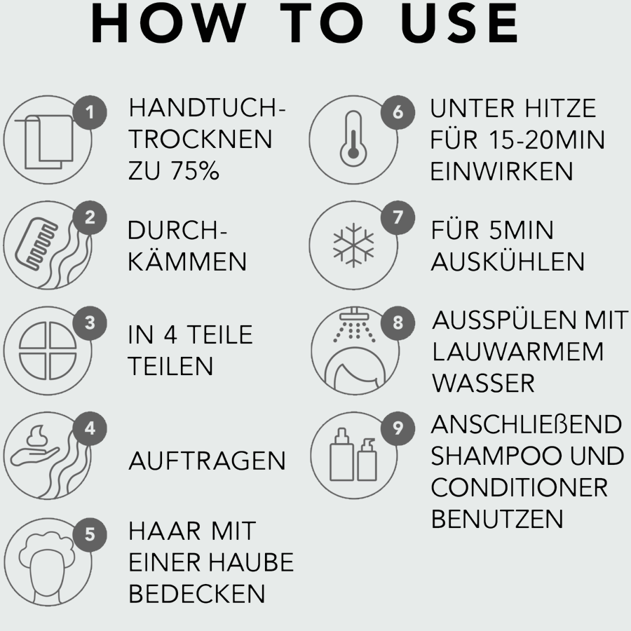 Trocknen Sie das Haar zu 75%, dann kämme es durch. Teilen Sie die Haare in vier Abteilungen. Tragen Sie Cellophanes auf und meiden Sie Kontakt mit der Kopfhaut. Bedecken Sie das Haar mit einer Haube und lasse es für 15-20 Minuten unter Hitze einwirken. Lassen Sie das Haar für 5 Minuten auskühlen, spülen Sie Cellophanes dann mit lauwarmem Wasser aus.