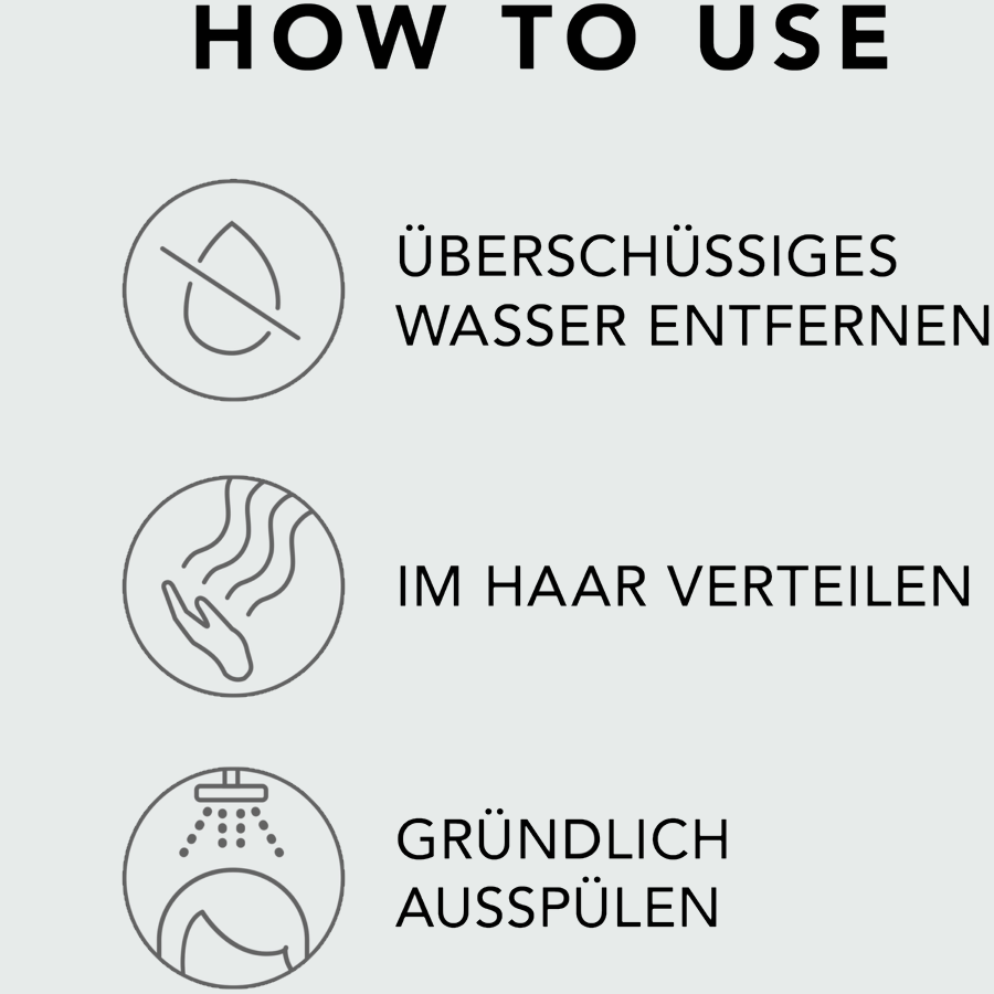 Überschüssiges Wasser ausdrücken und Conditioner im Haar verteilen und in den Spitzen konzentrieren. Einwirken lassen und sorgfältig ausspülen. Das Produkt ist für jedes Haar geeignet.