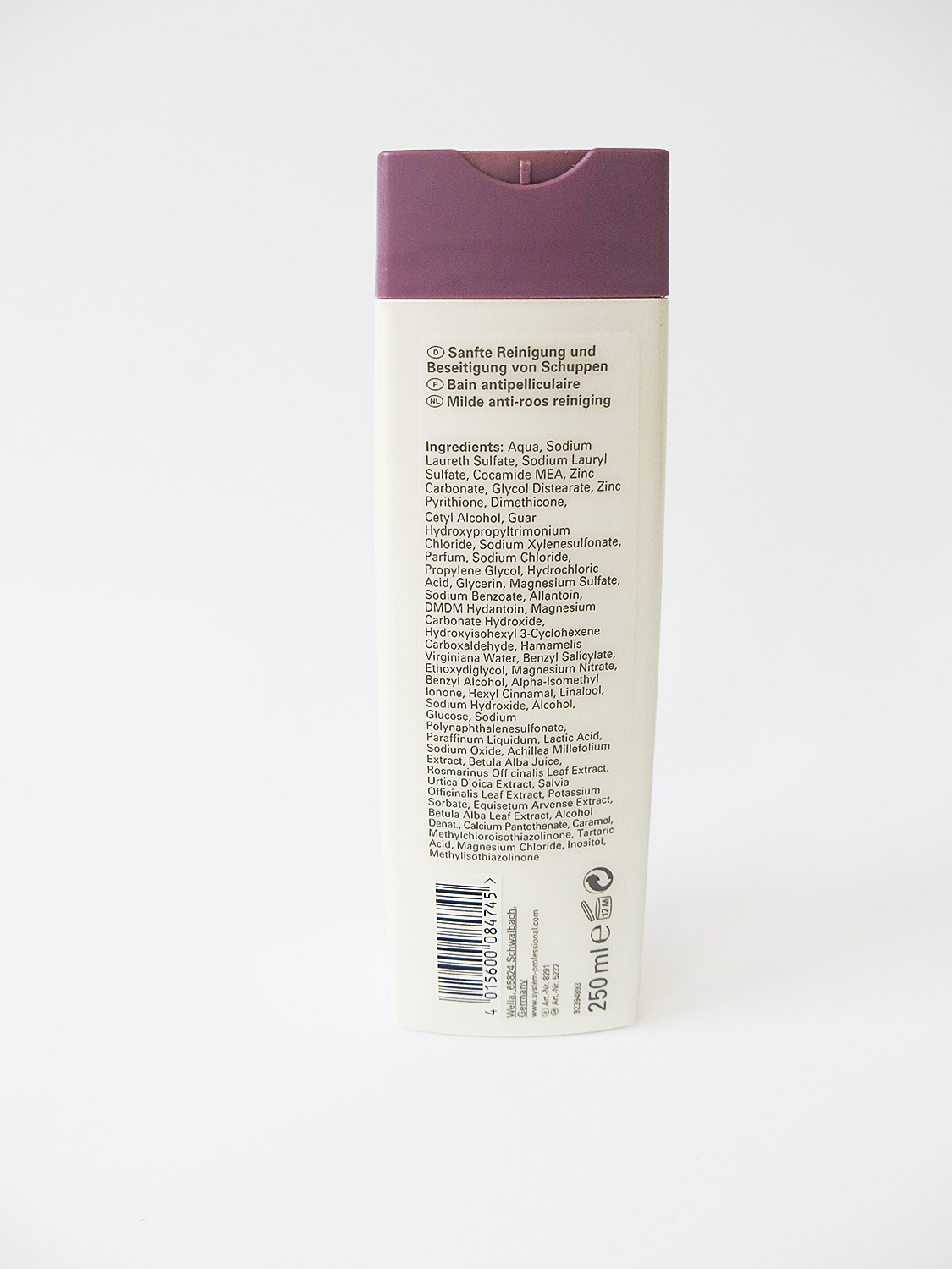 Aqua, Sodium Laureth, Sodium Lauryl Sulfate, Cocamide MEA, Zinc Carbonate, Glycol Distearate, Zinc Pyrithione, Dimethicone, Cetyl Alcohol, Guar Hydroxypropyltrimonium Chloride, Parfum,  Sodium Chloride, Propylene Glycol, Hydrochloric Acid, Glycerin, Magnesium Sulfate, Sodium Benzoate, Allantoin, DMDM Hydantoin, Ammonium Laureth Sulfate, Magnesium Carbonate Hydroxide,  Butylphenyl Methylpropional, Ethoxydiglycol, Benzyl Salicylate, Hydroxyisohexyl 3-Cyclohexene Carboxaldehyde, Benzyl Alcohol, Hamamelis Virginiana Water,  Alpha-Isomethyl Ionone, Hexyl Cinnamal, Linalool, Alcohol Denat., Hamamelis Virginiana Extract, Glucose, Sodium Polynaphthalenesulfonate,  Lactic Acid, Magnesium Nitrate, Achillea Millefolium Extract,  Betula Alba Juice, Betula Alba Leaf Extract, Equisetum Arvense Extract, Rosmarinus Officinalis Leaf Extract, Salvia Officinalis Extract, Urtica Dioica Extract, Potassium Sorbate, Citric Acid, EDTA, Calcium Pantothenate, Inositol, Caramel, Methylchloroisothiazolinone, Tartaric Acid, Magnesium Chloride, Methylisothiazolinone, Sodium Xylenesulfonate