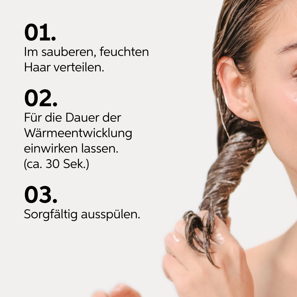 Ins feuchte Haar geben und gleichmäßig verteilen. Etwa 30 Sekunden einwirken lassen, bis sich der wärmende Effekt entfaltet hat. Gründlich ausspülen.