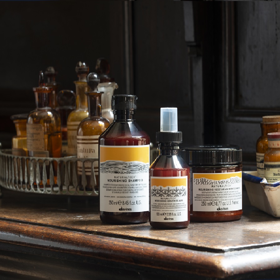 Die Nourishing Familie enthält pflanzliches Keratin, eine Kombination aus Reisprotein und einer Mischung aus Aminosäuren, sowie dem Biacid Bond Complex, einer Kombination aus Mole-külen, die von den Davines Forschungs- und Entwicklungslaboren entwickelt wurde. Die Produkte beleben geschädigte Bereiche wieder, indem sie die Kutikula versiegeln, so dass das Haar geschmeidig und genährt bleibt und noch länger hält als bisher: