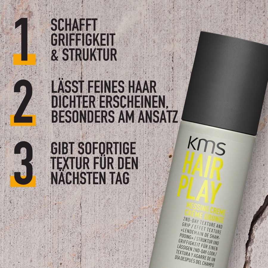 Diese Creme sorgt für Struktur, Griffigkeit und Fülle. Sie kann auch für einen lässigen 2nd Day Look sorgen. Mit mittel starkem aber flexiblem Halt definieren und strukturieren. Die Formel des HAIRPLAY Messing Creme enthält keine tierischen Inhaltsstoffe.