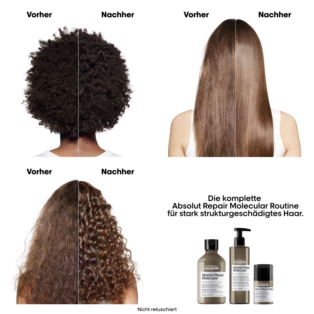 Das Absolut Repair Molecular Leave-In von L'Oréal Professionnel Paris wurde speziell für stark strukturgeschädigtes Haar entwickelt. Repariert 2 Jahre Haarschäden in nur einer Anwendung.* Angereichert mit Peptidbondern und 5 Aminosäuren, dringt es tief in die molekulare Haarstruktur ein und verwandelt das Haar sofort. Die leichte Textur der Formel dringt sofort in die Haarfaser ein und gibt ihr neue Kraft. Das Haar glänzt, ist geschmeidig und vor äußeren Einflüssen geschützt. Hitzeschutz bis 230°C**. Stärke, Elastizität und Beweglichkeit des Haares werden wiederhergestellt. Das Ergebnis: kräftiges, gesund aussehendes & fließendes Haar.
