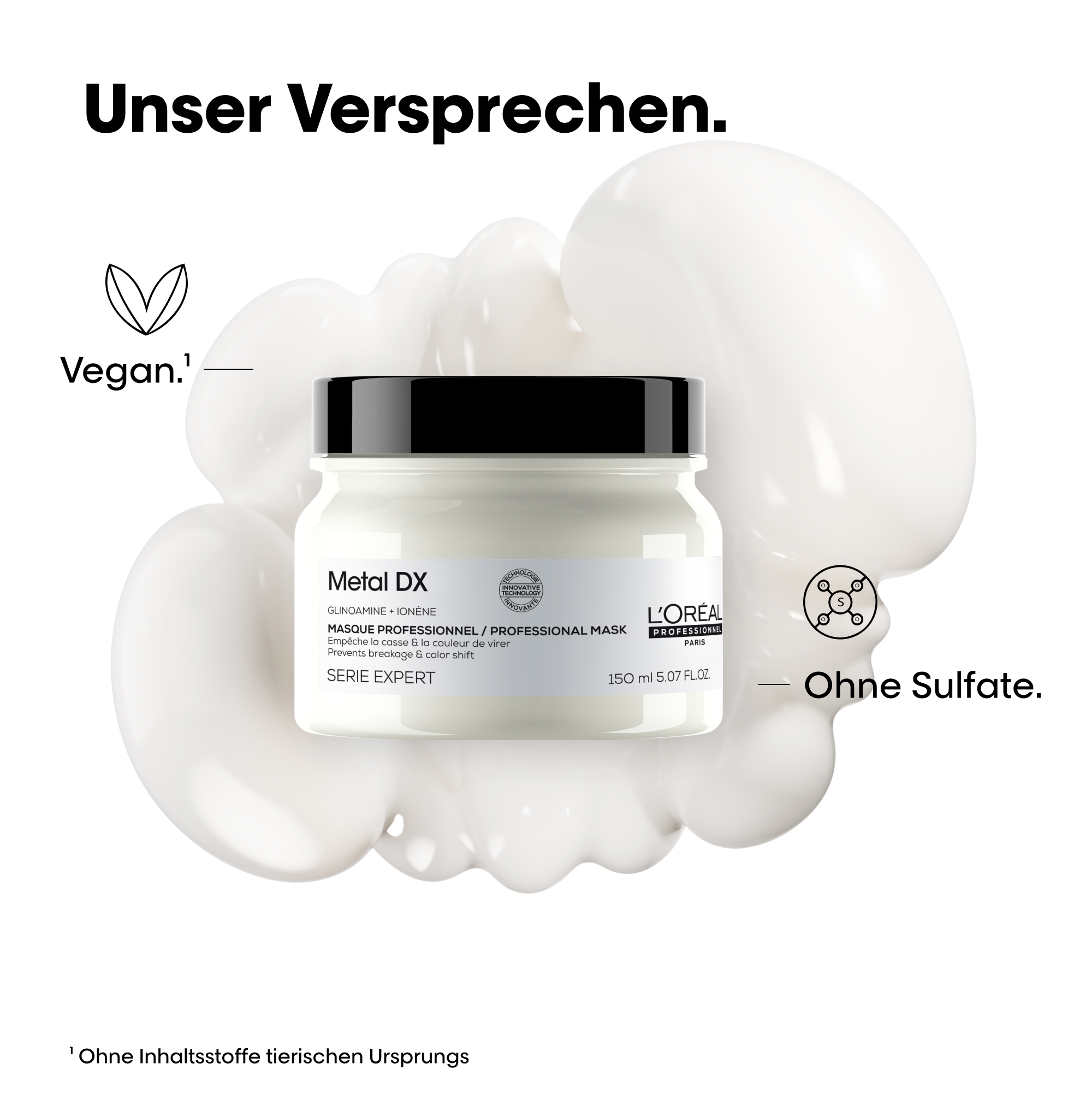 Professionelle Maske Die Pro Garantie für Deine Coloration, Balayage und Blondierung. Die Metal DX Maske von L'Oréal Professionnel für Zuhause schützt das Haar vor Metallablagerungen* nach jeder Coloration , Balayage und Blondierung und zwischen den Friseurbesuchen. Sie hilft die Farbbrillianz und den Glanz des Haares zu erhalten. Das Haar ist sofort geschmeidiger und gepflegter. *Kupfer Das Haar ist weniger brüchig, intensiv genährt und gläzend. Für -87% weniger Haarbruch** und 100% verlässliche und langanhaltende Farben.