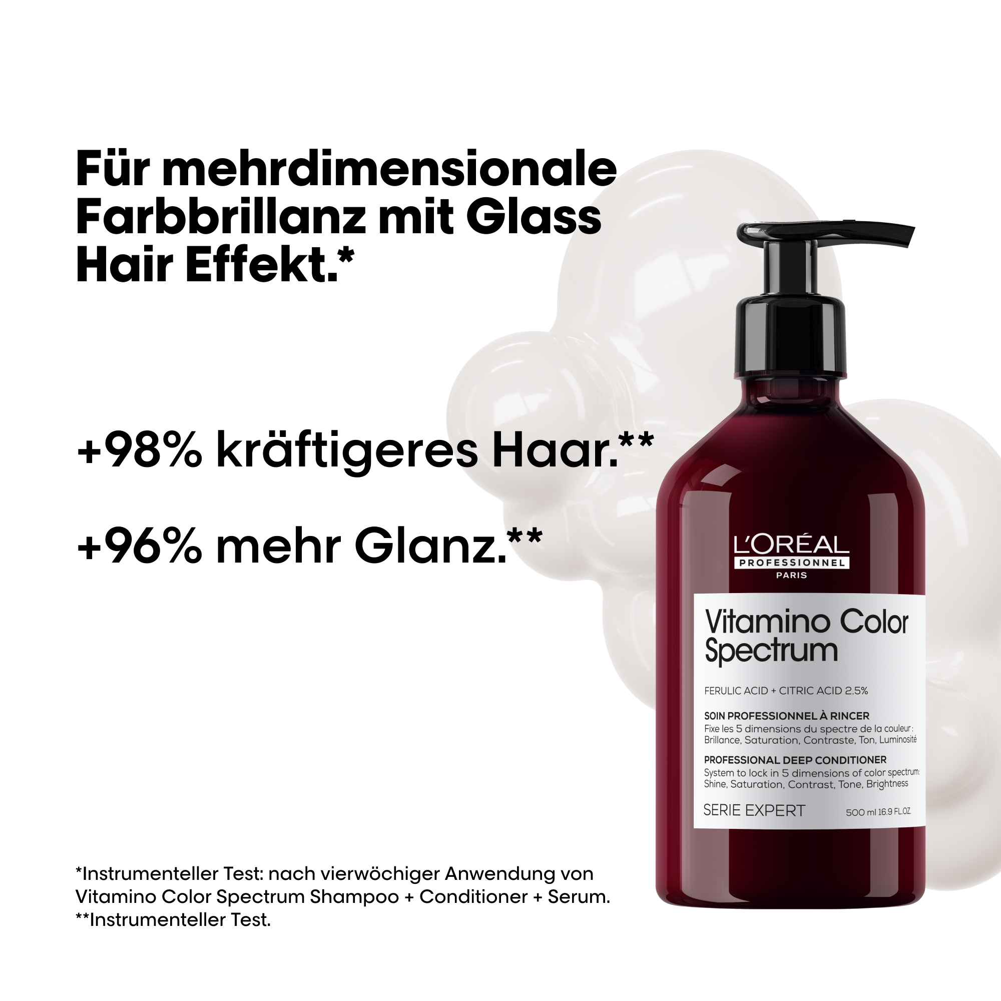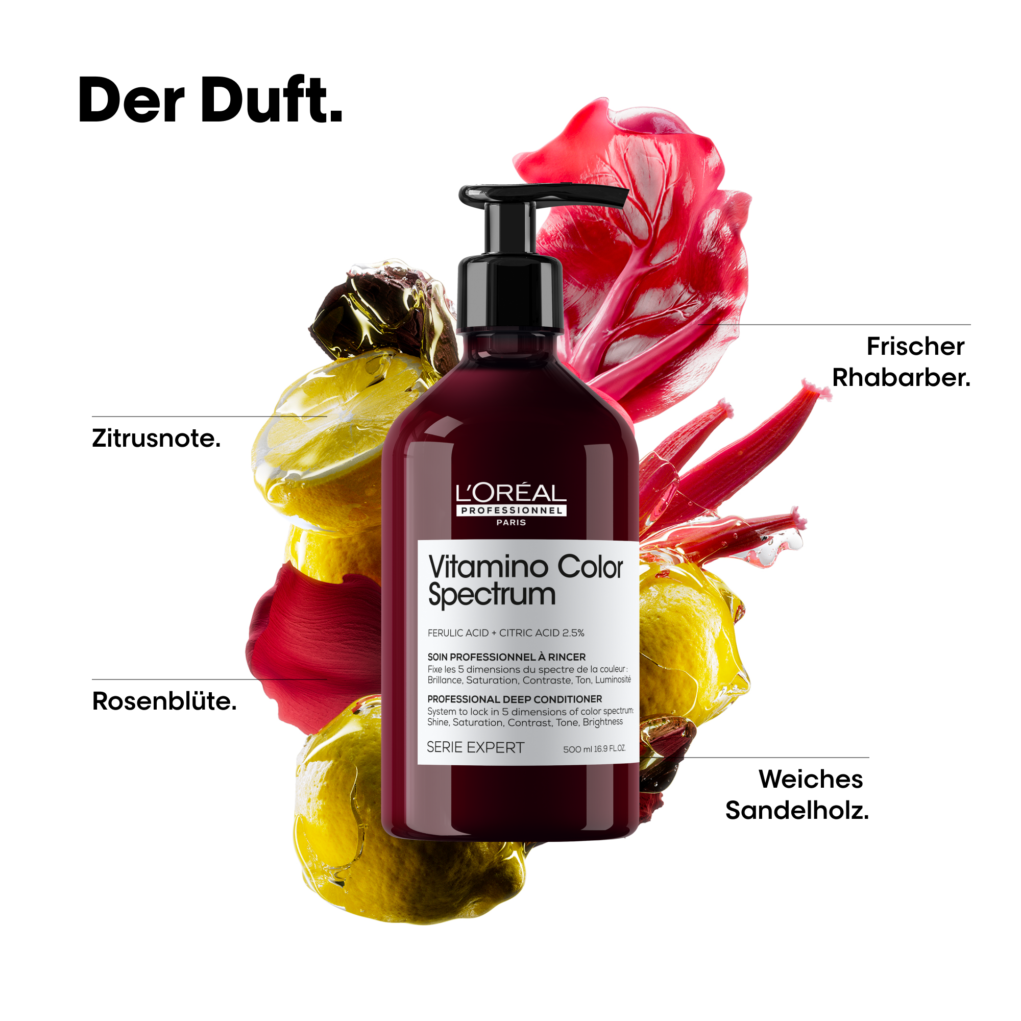Der Vitamino Color Spectrum Deep Conditioner von L'Oréal Professionnel wurde speziell für coloriertes Haar entwickelt. Angereichert mit Ferulasäure und 2,5% Zitronensäure hilft er, die Farbpigmente im Haar einzuschließen & die Brillanz in allen 5 Farbdimensionen zu erhalten.*