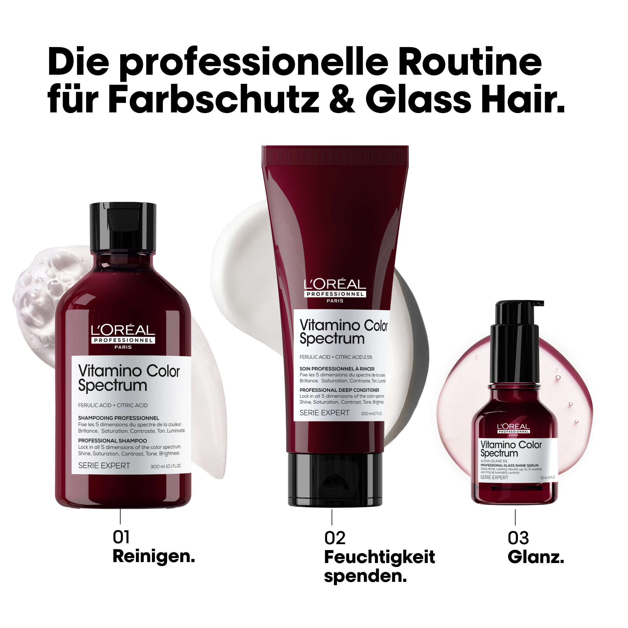Nach der Haarwäsche mit dem Vitamino Color Spectrum Shampoo den Deep Conditioner auf das nasse Haar auftragen. Das Haar in 4 Partien aufteilen und das Produkt gleichmäßig von den Längen bis in die Spitzen auftragen. 1-2 Minuten lang einmassieren. Gründlich ausspülen. Anschließend das Vitamino Color Spectrum Glass Shine Serum Leave-in auftragen. Pro-Tipp: Verwende das neutralisierende Shampoo mindestens einmal pro Woche oder so oft wie nötig anstelle des klassischen Shampoos. Wähle das richtige neutralisierende Shampoo entsprechend deiner Haarfarbe. Lila Shampoo für blondes Haar, blaue Shampoos für hellbraunes Haar, grüne Shampoos für dunkelbraunes Haar.