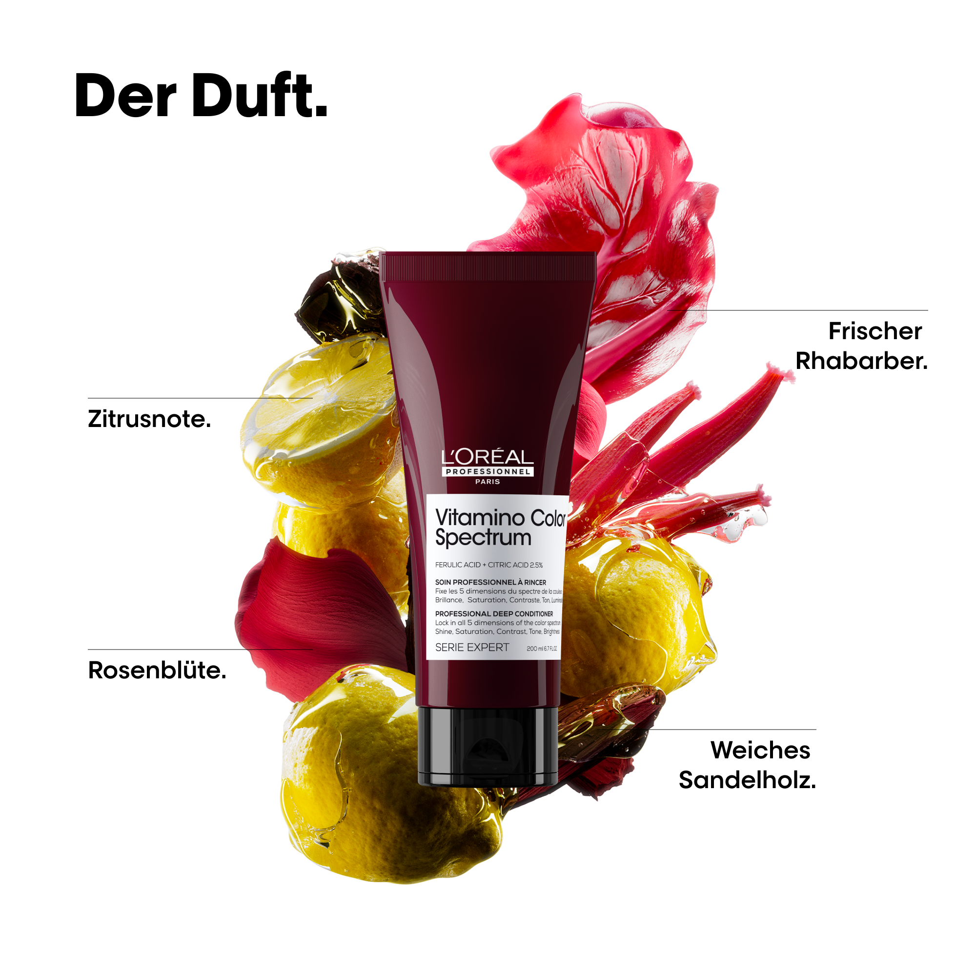 Der Vitamino Color Spectrum Deep Conditioner von L'Oréal Professionnel wurde speziell für coloriertes Haar entwickelt. Angereichert mit Ferulasäure und 2,5% Zitronensäure hilft er, die Farbpigmente im Haar einzuschließen & die Brillanz in allen 5 Farbdimensionen zu erhalten.*