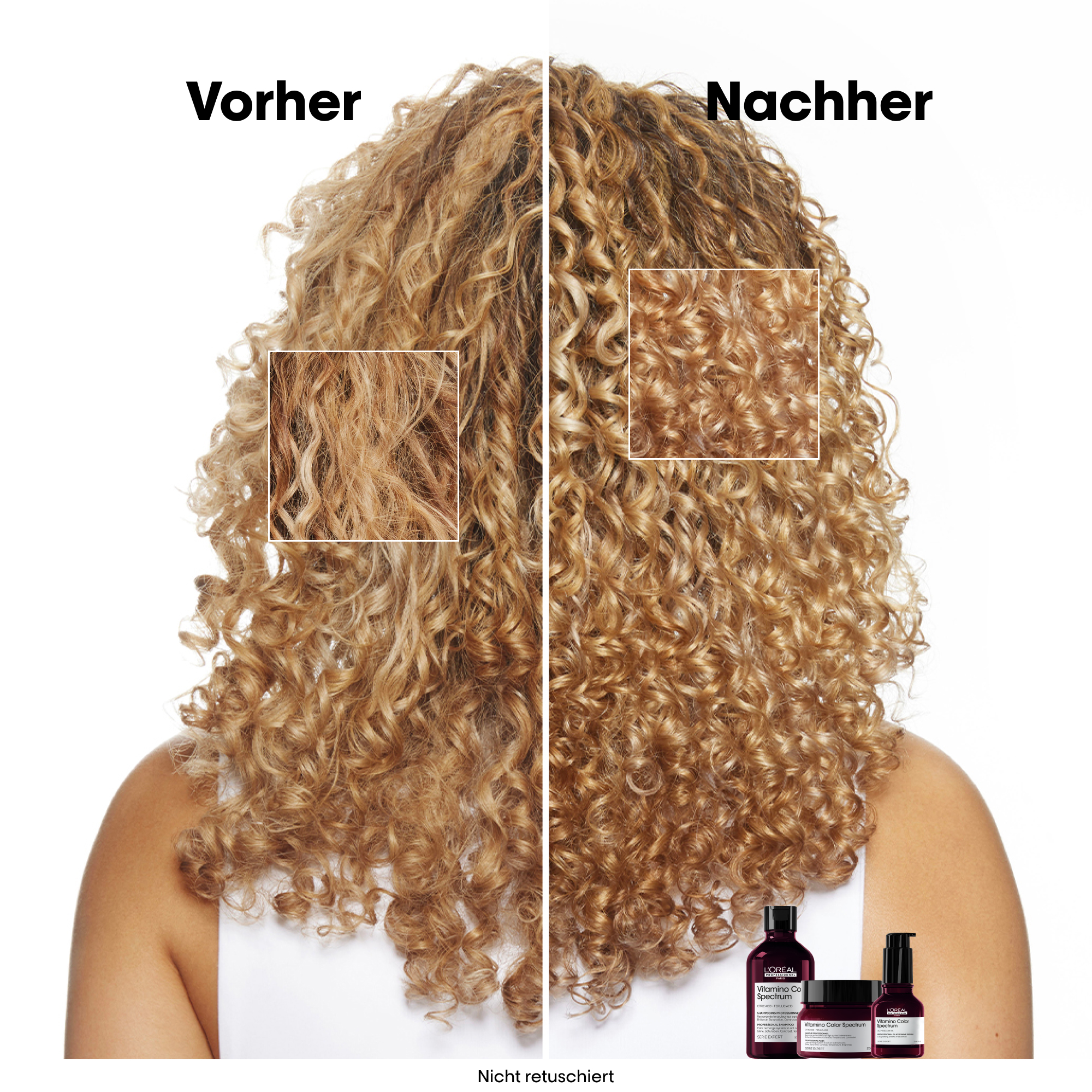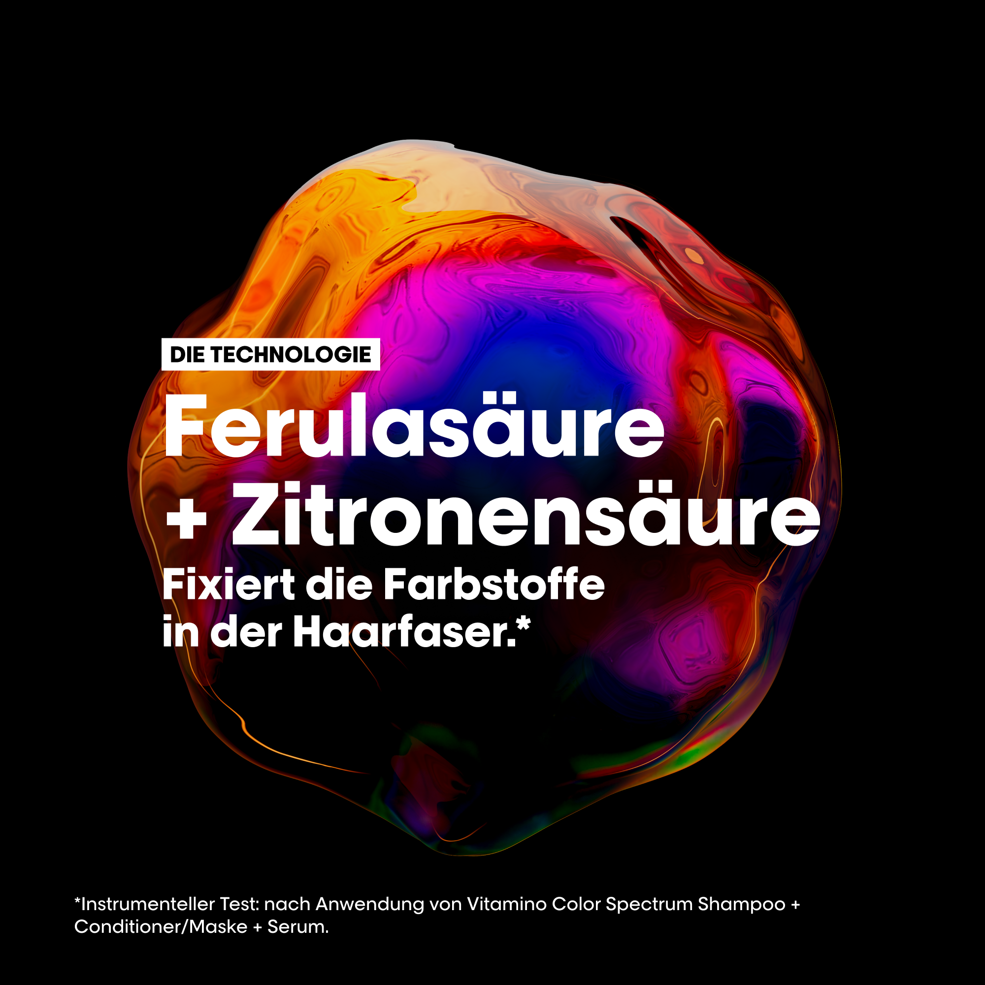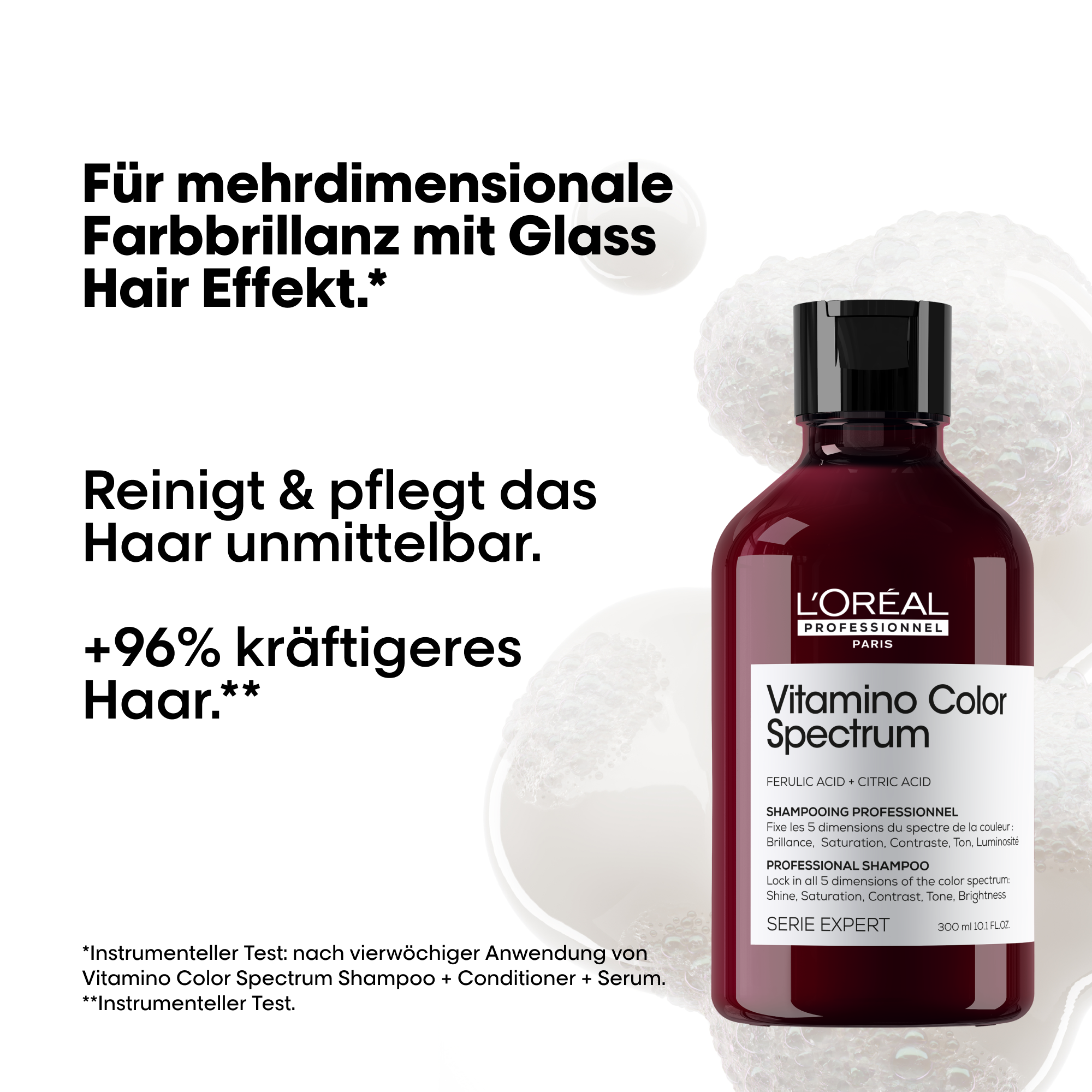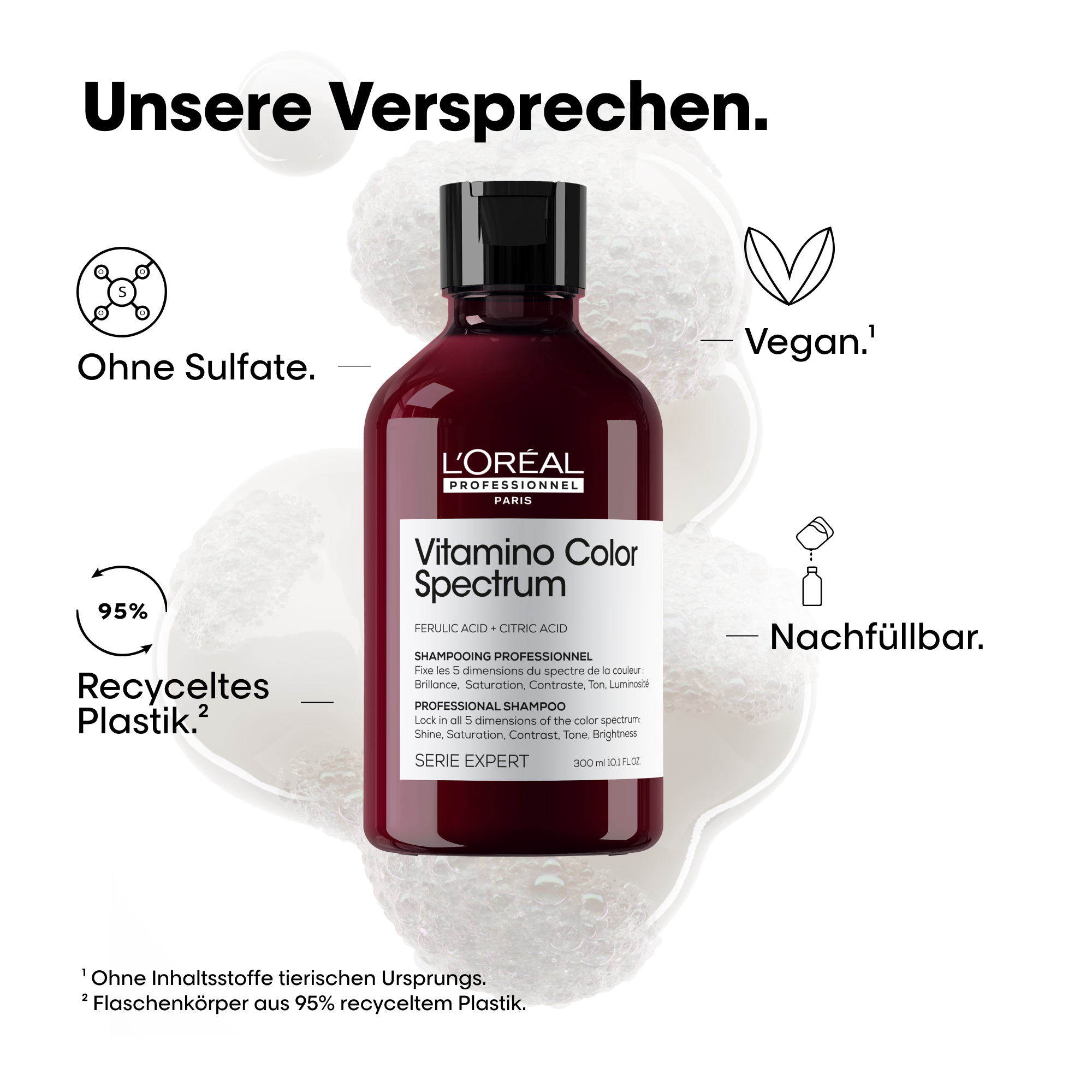 Das Vitamino Color Spectrum Shampoo von L'Oréal Professionnel wurde speziell für coloriertes Haar entwickelt. Angereichert mit Ferula- & Zitronensäure hilft es, die Farbpigmente im Haar einzuschließen und so die Brillanz in allen 5 Farbdimensionen zu erhalten.*