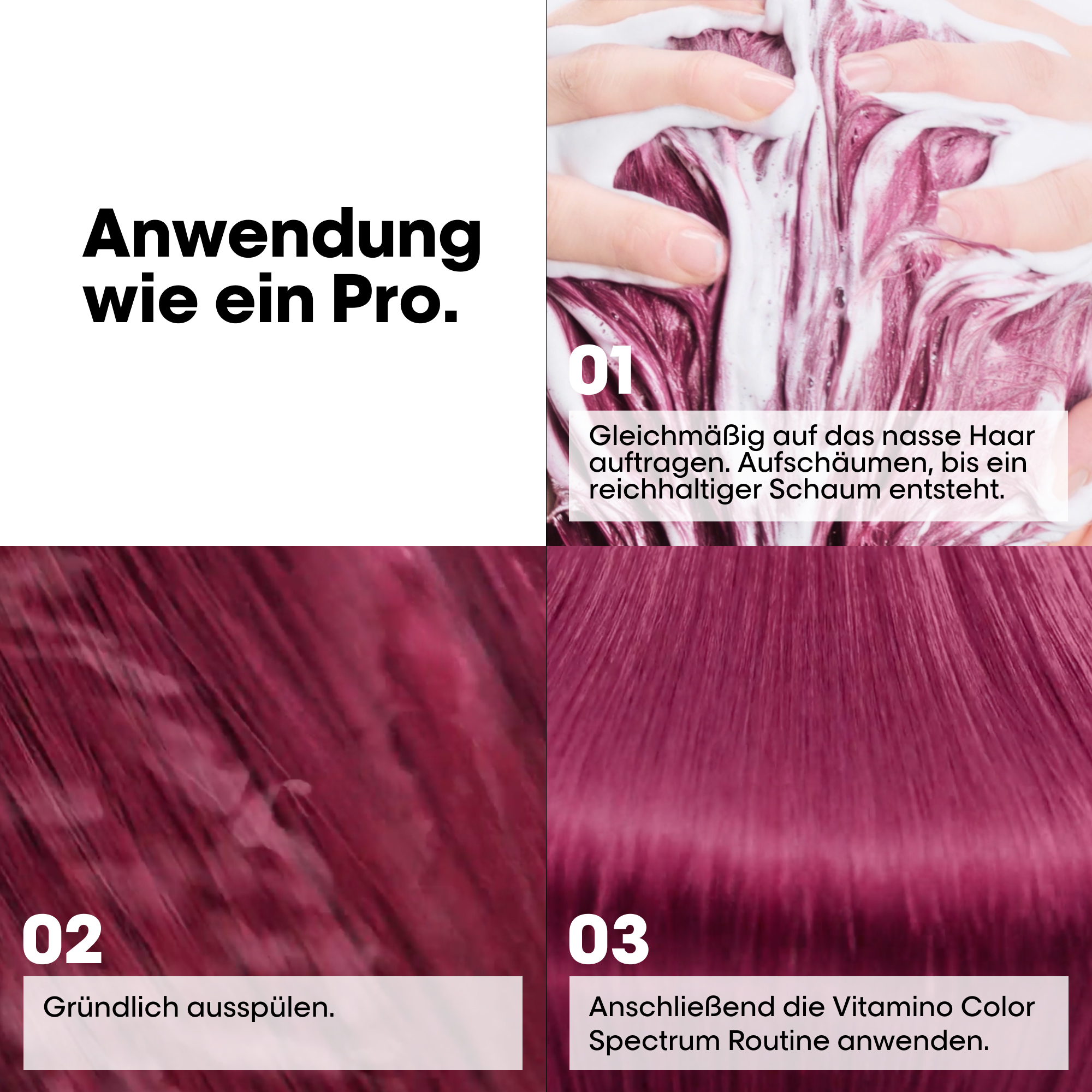 Gleichmäßig auf das nasse Haar auftragen. Aufschäumen, bis ein reichhaltiger Schaum entsteht. Gründlich ausspülen. Anschließend den Vitamino Color Spectrum Deep Conditioner und das Glass Shine Serum verwenden. Bei Bedarf die Maske für extra Geschmeidigkeit verwenden. Pro-Tipp: Mindestens einmal pro Woche das Neutralizing Shampoo anstelle des üblichen Shampoos verwenden. Das Shampooo entsprechend der Haarfarbe wählen: Purple Dyes für blondes Haar, Blue Dyes für hellbraunes Haar, Green Dyes für dunkelbraunes Haar.