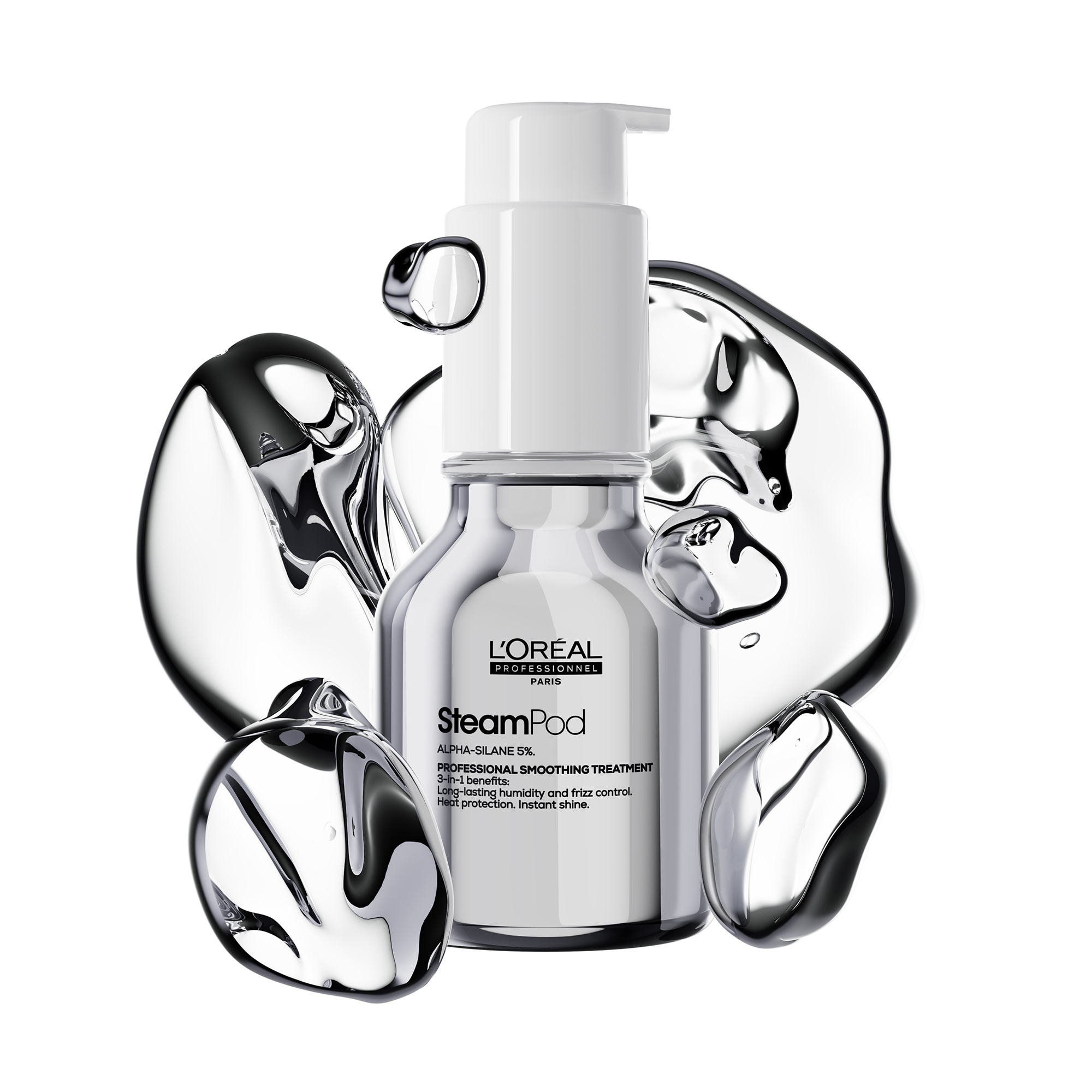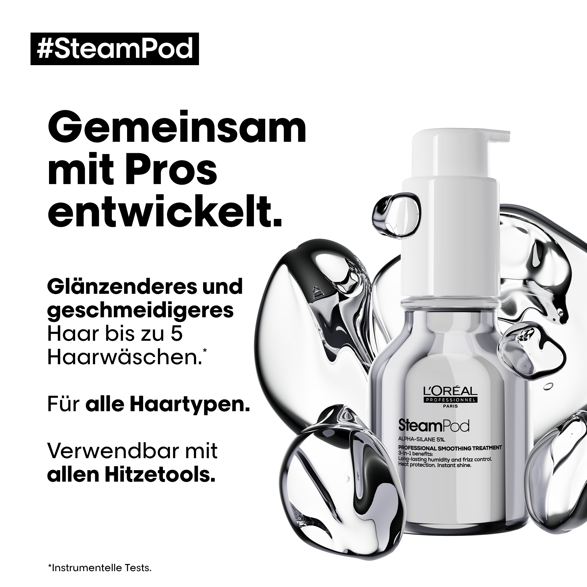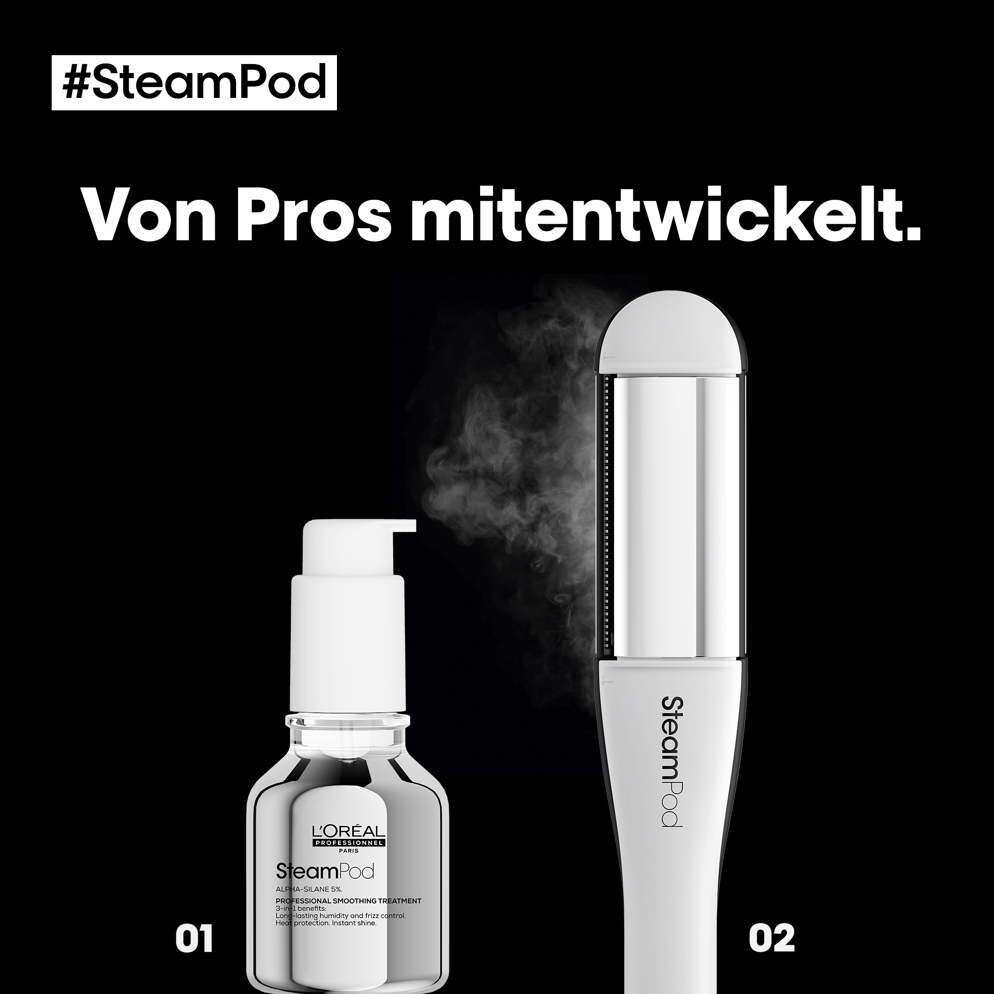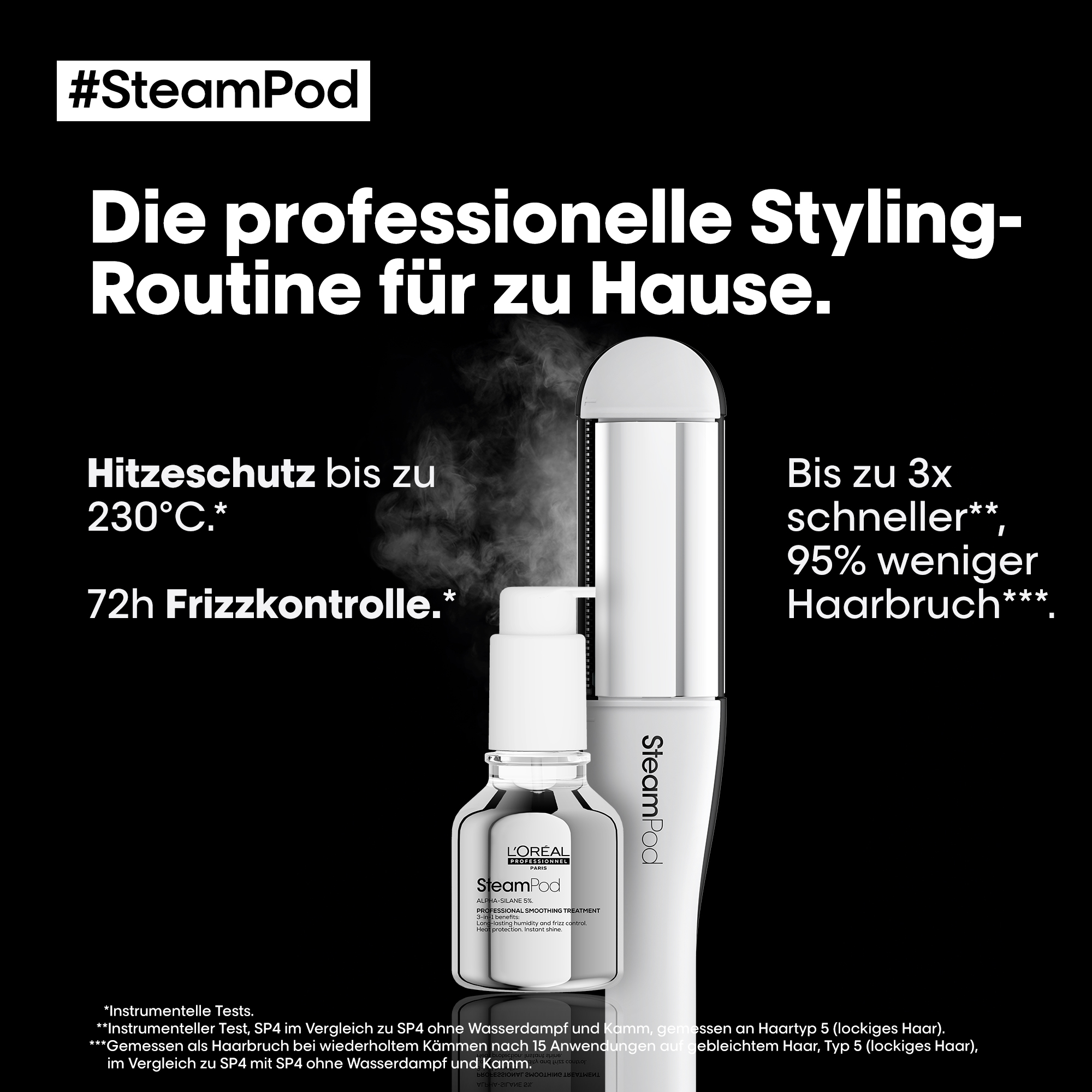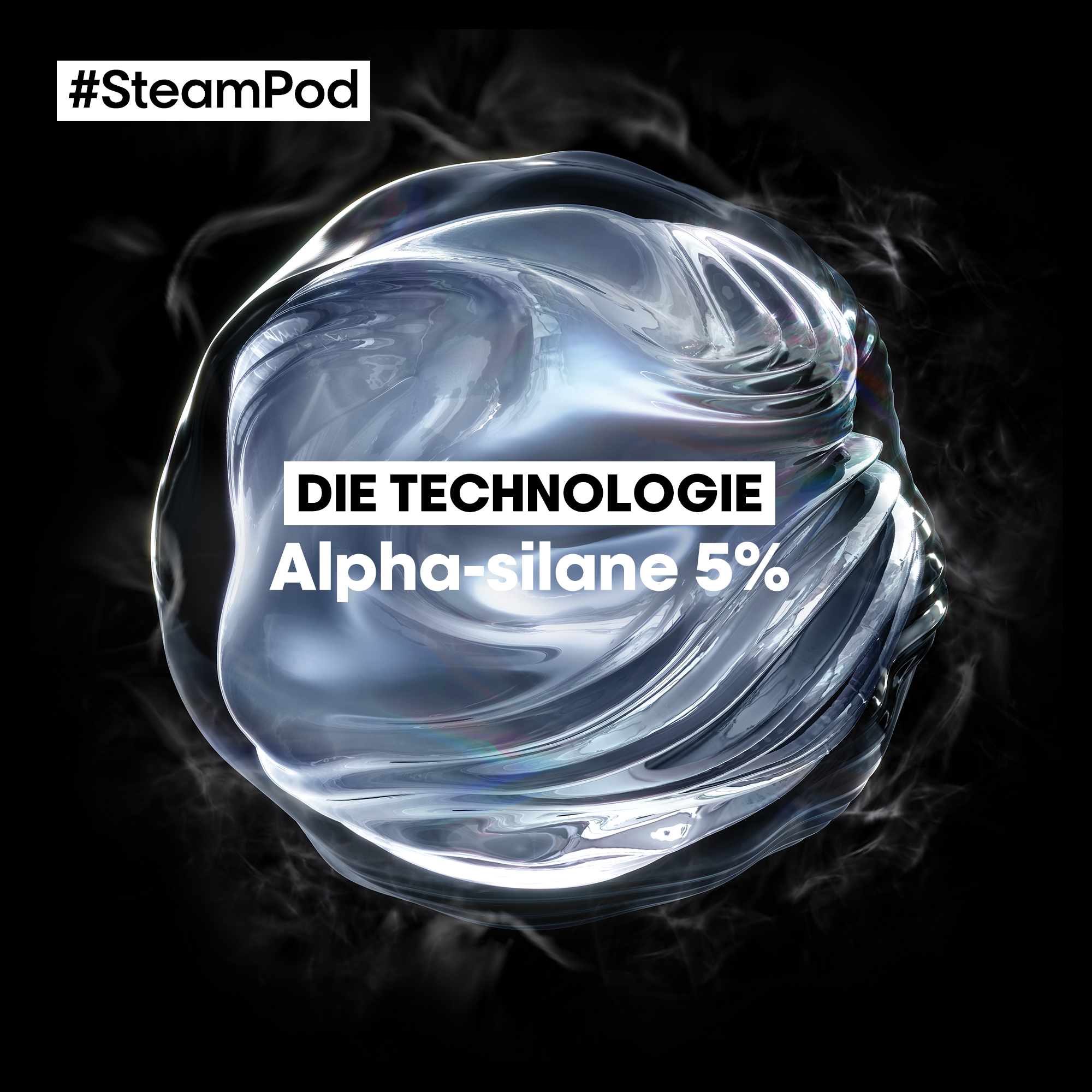 Das professionelle SteamPod Glättungskonzentrat ist das erste Thermo-Schutz-Konzentrat, das mit Alpha Silane angereichert ist, um das Haar vor Hitze und hoher Luftfeuchtigkeit zu schützen. Dieses patentierte Konzentrat von L'Oréal Professionnel ist ohne Wasser formuliert und mit Alpha Silane angereichert, einem aktiven Pflegewirkstoff, der vor Hitze und hoher Luftfeuchtigkeit schützt. Alpha Silane wird durch Hitze aktiviert und durch Dampf verstärkt und bildet eine Schutzschicht um die Haarfaser, die bis zu 5 Haarwäschen* standhält.