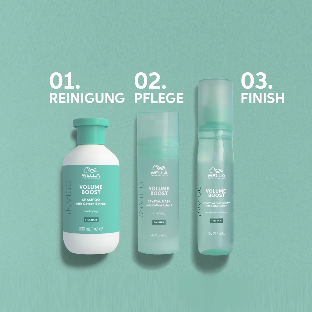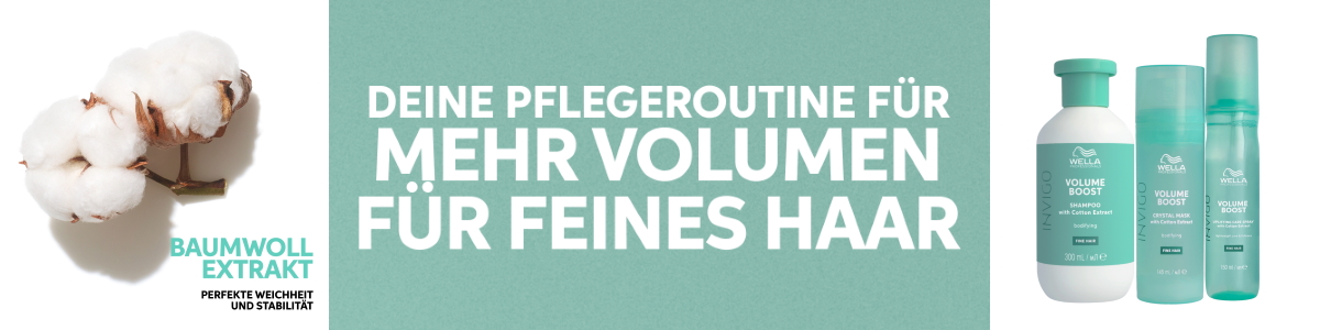 Sorgen Sie für Pflege ohne Ihr Haar zu beschweren und für sichtbar mehr Volumen. INVIGO Volume Boost mit Volume Boost-Komposition™ hat eine leichte Rezeptur, welche Ihr kämmbar macht und ihm Glanz verleiht. Volumengebende Polymere umschließen die Haarfasern, stabilisieren sie und sorgen beim Föhnen für unglaublich voluminöse Looks. Baumwolle ist eine weiche und stabile Faser mit ähnlicher Stabilität und Weichheit, wie sie für volumenreiches feines Haar benötigt wird. Die Volume-Boost-Komposition™ pflegt das Haar mit leichten Rezepturen und sorgt für gepflegtes Haar voller Fülle. Die leichten rezepturen machen das Haar kämmbar und verleihen ihm Glanz. Dabei wird selbst feines Haar nicht beschwert. Volumengebende, sprungkraftverstärkende polymere umschließen die Haarfasern, stabilisieren sie und sorgen beim föhnen für unglaublich voluminöse looks.