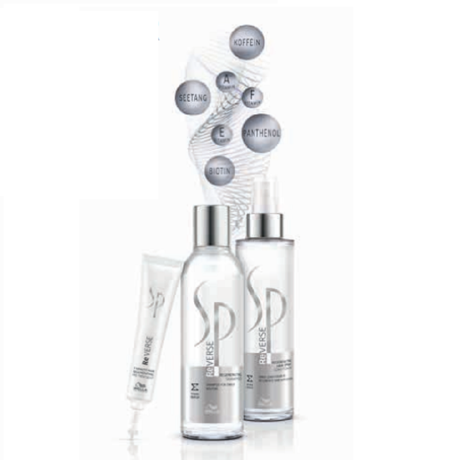 Die Sp Serie für gestresstes Haar. Sie regeneriert und verwöhnt Ihr gestresstes Haar nachhaltig und gibt ihm dank des „ReVerse Vitamin-Complex“ neue Kraft, wunderbare Geschmeidigkeit, natürlichen Glanz und Vitalität zurück. Der neu entwickelte ReVerse Vitamin-Complex enthält die Vitamine A, B5, E, F und Inhaltsstoffe wie Seetang, Biotin, Panthenol und Koffein, welche Ihrem Haar nicht nur Kraft, Glanz und Geschmeidigkeit verleiht, es erhält auch seine Vitalität zurück. Und auch der enthaltene „Regeneration“-Service macht das Haar leicht frisierbar.