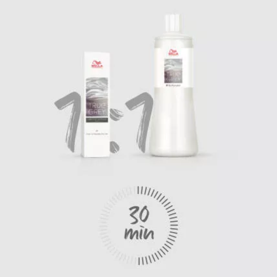 – 7 oxidativen Tonern auf Graubasis, die den natürlichen Farbton von schönem grauen Haar imitieren. Es ist nicht nötig, die Toner untereinander zu mischen. Jeder Toner ist so konzipiert, dass er pur, gemischt mit dem Aktivator, verwendet werden kann.