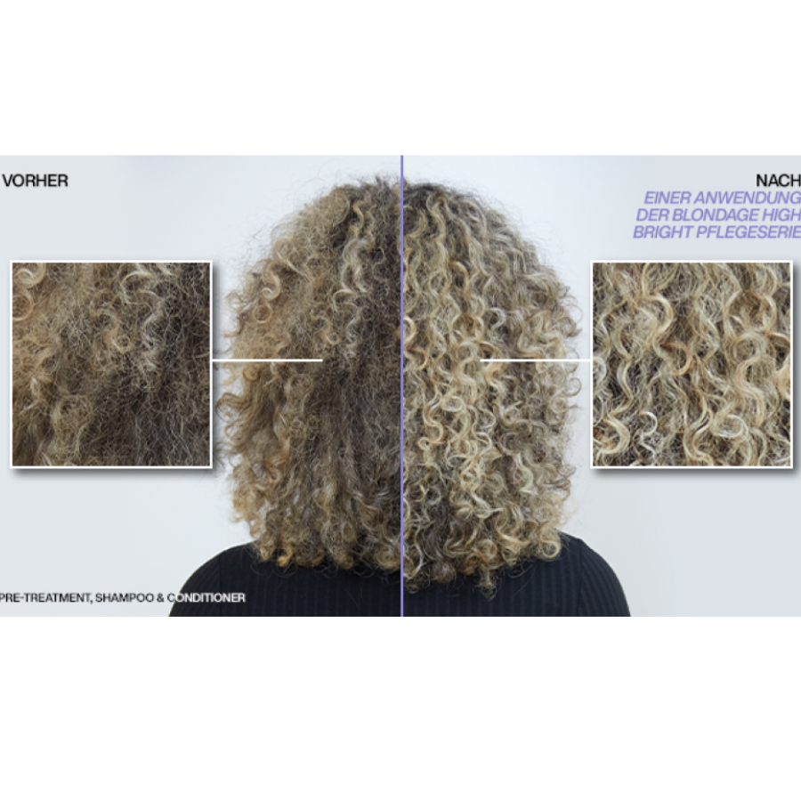 Blondage High Bright ist eine Haarpflege Serie für Blondes Haar (Tonhöhe 7-10). Durch die Kraft von Vitamin C wird mattes dunkles Blond wieder strahlend, leuchtend und glanzvoll. Vitamin C ist bereits für aufhellende Ergebnisse in der Hautpflege bekannt und wird nun auch in die Haarpflege integriert. Die Kombination aus Vitamin C und dem Brigthening Care Komplex gibt deinem blonden Haar alles was es benötigt um wieder an Leuchtkraft und Glanz zu gewinnen. Durch den Aufhellungseffekt kann die Zeit zwischen den Blondierungsservices verlängert werden. Dein Blond sieht länger strahlend, leuchtend und gesund aus.