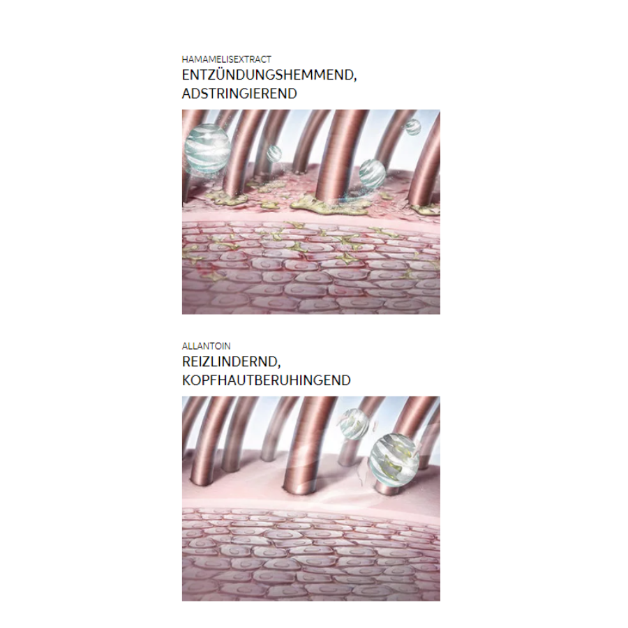 Befreit als eine Kombination aus Shampoo und Peeling zuverlässig von Schuppen. Die Neubildung von Schuppen wird verringern,  bei regelmäßiger vier Wochen Anwendung können Sie von einer bis zu 2 monatigen Schuppenfreiheit profitieren. Das Haar wird sanft gepflegt und erhält ein glänzendes, geschmeidiges Aussehen ohne strapaziert zu werden.