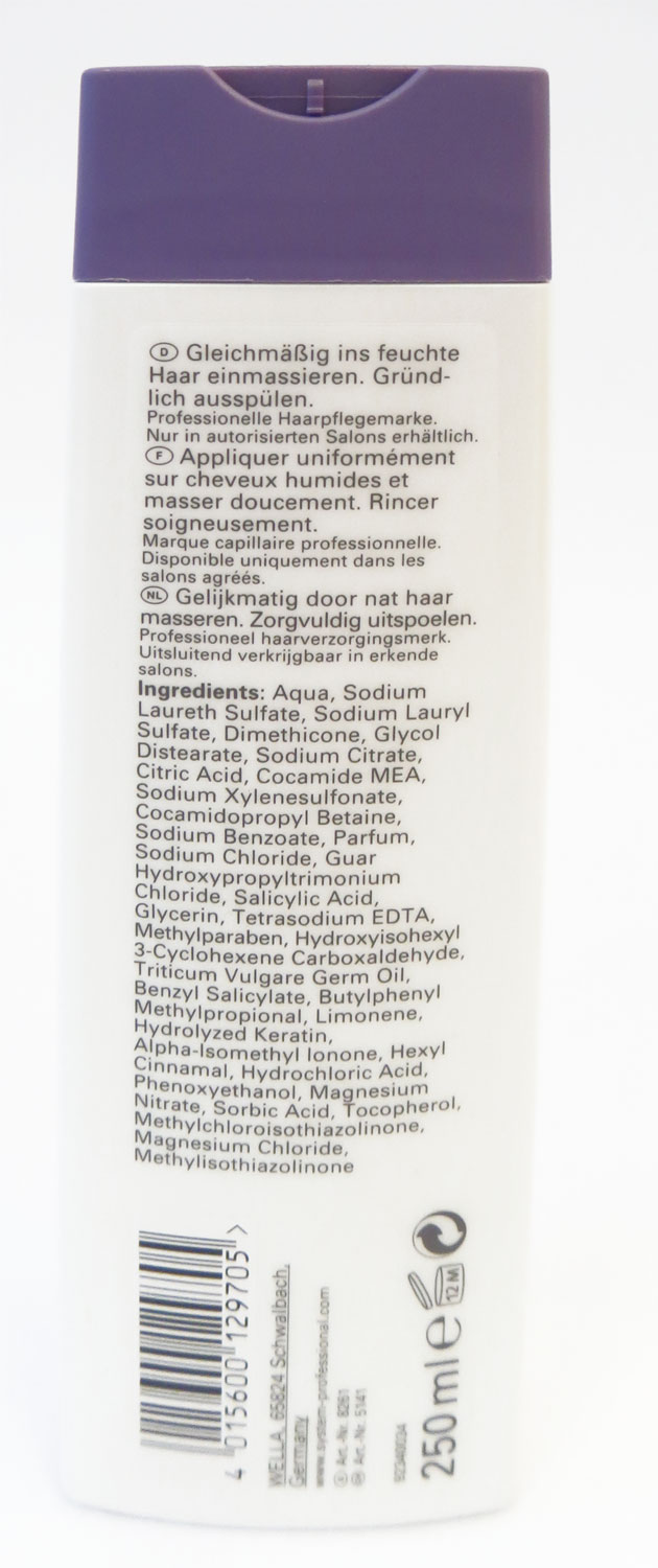 Aqua, Sodium Laureth Sulfate, Sodium Lauryl Sulfate, Dimethicone, Glycol Distearate, Sodium Citrate, Cocamide MEA, Sodium Xylenesulfonate, Cocamidopropyl Betaine, Parfum, Sodium Benzoate, Sodium Chloride, Citric Acid, Guar Hydroxypropyltrimonium Chloride, Salicylic Acid, Glycerin, Tetrasodium EDTA, Methylparaben, Hydroxyisohexyl 3-Cyclohexene Carboxaldehyde, Triticum Vulgare Germ Oil, Benzyl Salicylate, Hydrolyzed Keratin, Butylphenyl Methylpropional, Limonene, Benzyl Alcohol, Alpha-Isomethyl Ionone, Hydrochloric Acid, Hexyl Cinnamal, Phenoxyethanol, Magnesium Nitrate, Tocopherol, Ethylparaben, Isobutylparaben, Butylparaben, Methylchloroisothiazolinone, Propylparaben, Magnesium Chloride, Methylisothiazolinone